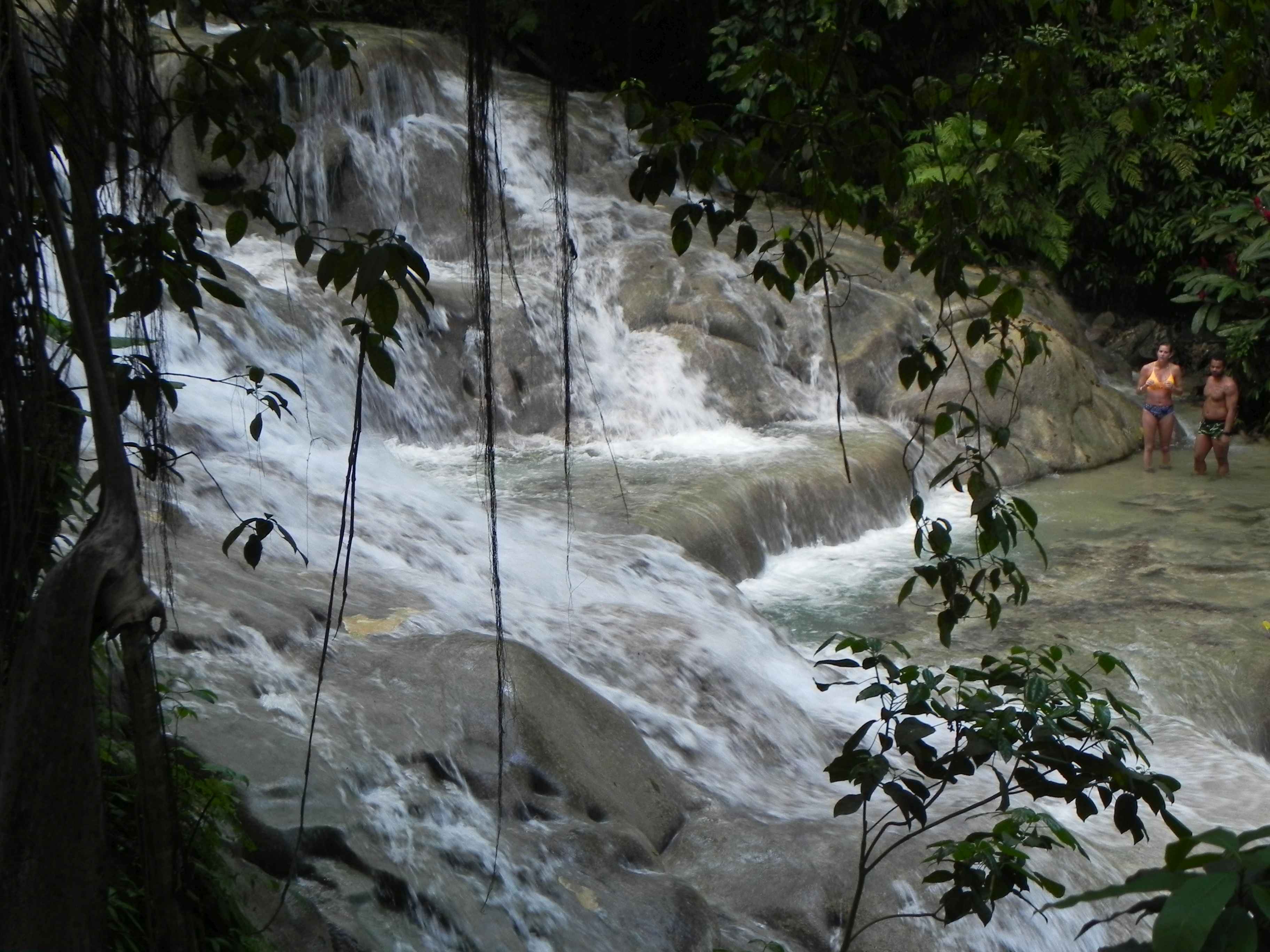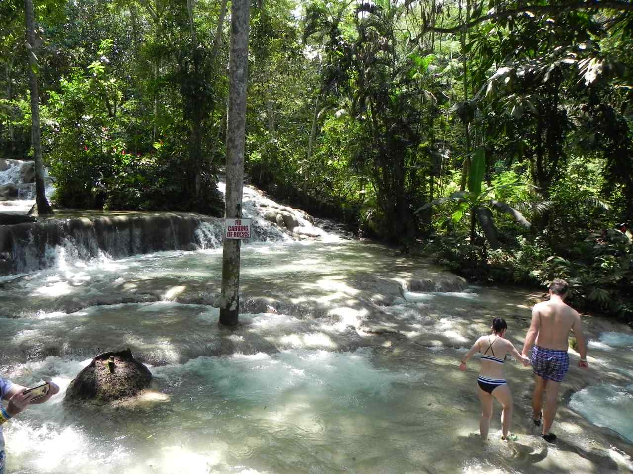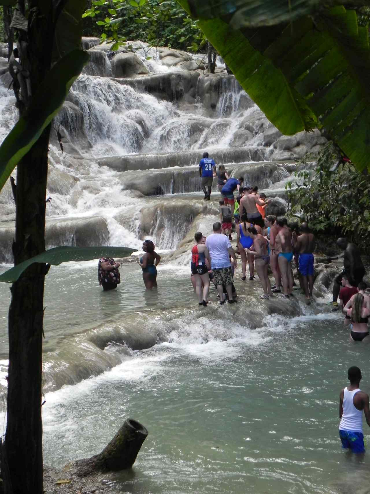 Im Terminal von Ochos Rios, man darf sich aber nicht allzuviel vorstellen. Es war nur ein großes stabiles Zelt, bekommen wir unsere Ausflugsbänder an das Handgelenk. Danach müssen wir auf die Geländewagen warten, eine Viertelstunde später sind sie dann da, und wir können aufsteigen in die großen Jeeps. Jeder der Fahrgäste muß eine Verzichtserklärung für den Fall eines etwaigen Unfalls unterschreiben. Wir fahren durch den kleinen Ort Ochos Rios, ein paar Kilometer weiter geht es eine bewaldete Anhöhe hoch, und schon sind wir an unserem ersten Ziel angekommen. Nach dem Aussteigen wird es erstmals etwas Chaotisch, die Fahrer sprechen ein Landes-typisches Englisch, die meisten Fahrgäste verstehen nicht was sie sagen. Wir folgen einem Führer mit weißem T-Shirt, der uns dann zu den Wasserfällen führt.