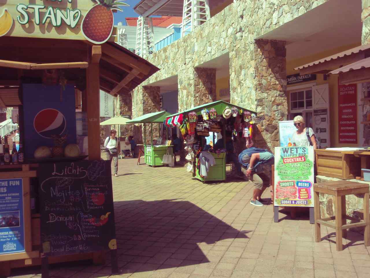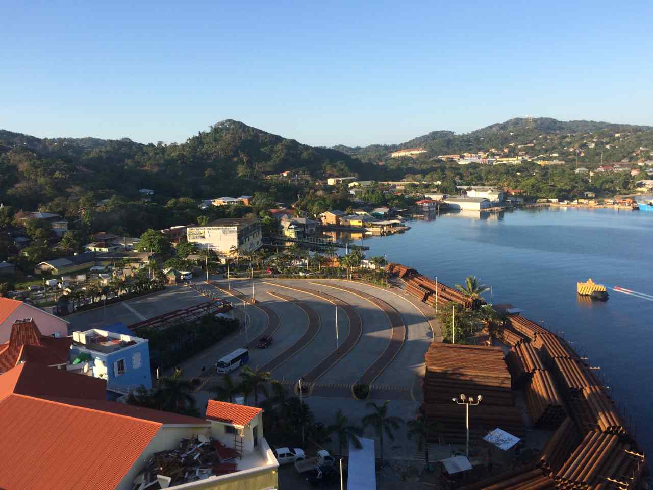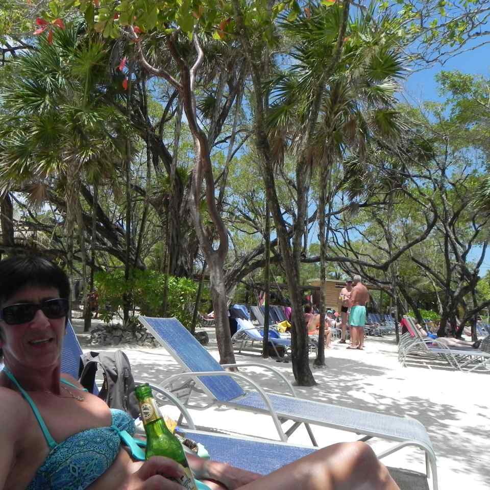 Mit einem kleinen Plattform-Boot fahren wir so einen Kilometer hinaus bis die kleine Insel erreicht ist. Sie haben hier ca. 200 Liegestühle und ein paar Hängematten, man kann hier Schnorcheln, Paddelboote mieten und vieles mehr. Die Botanik hier auf der Insel war außergewöhnlich, Bäume mit einem sehr bizarren Astbewuchs, es gibt aber auch Palmen hier. Später holten wir uns ein heimisches Bier vom Restaurant, das ganz passabel schmeckte, der Preis war mit 4 US Dollar relativ hoch wie überall auf Roatan bzw. Honduras. Nach der Aussage unseres deutschen Reiseleiters liegen die Preise hier auf der Insel um 30% höher als in Europa, bei einem durchschnittlichen Einkommen von etwa 400-500 US Dollar. Folgedessen müssen beide Ehepartner arbeiten um Essen zu können, ein Auto gehört hier nicht zum heimischen Lebensstandard. Hier in Roatan befindet sich das zweitgrößte Korallenriff der Welt, das von Venezuela die Küste hinauf bis nach Belize geht. Es ist zum Gegensatz zum Graet Barrier Riff kerngesund, die Wassertemperatur von 26 bis 31°, der Algenbewuchs samt der Anzahl und Größe der Fische, alles stimmt hier. Roatan besitzt sogar eigene Kläranlagen wo die Abwässer der Häuser gereinigt werden. Heute Mittag waren wir die einzigen Gäste auf der Insel Big French Key, und die mein Schiff 6 lag als einziges Schiff hier auf Roatan auf Reede. Wir waren von etwa 10:00 bis 13:20 in dem Freizeit-Paradies. Es gibt zwei kleine Souvenier-stände, nach längerem Suchen entscheiden wir uns für so eine Art Teller mit dem Bild von der Insel Roatan. Später konnte ich noch feststellen daß es hier durchaus auch Stechmücken gab. Trotz dem einsprühen mit einem Mückensprühmittel wurde ich zweimal gestochen. Während unser Rückfahrt erzählt uns der Reiseleiter einiges über das Leben in Honduras.