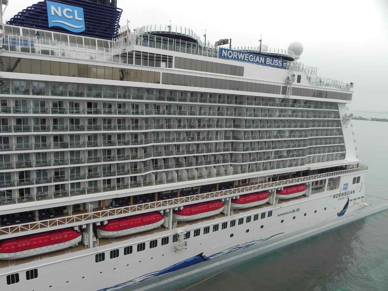 Nachdem wir uns gedreht haben und angelegt hatten befand sich jetzt auf unserer Backbordseite die Norwegian Bliss, sie wurde erst im Frühjahr 2017 bei Meyer in Papenburg übergeben, ein riesiges Schiff mit 19 Decks und einer Schiffsgröße von über 163.000 BRZ. Und einer Länge von 325 mt. mit insgesamt 4200 Gästen. Auf der uns zugewandten Seite konnten wir auf den obersten Decks eine Kartbahn sehen, sie soll auf der zweigeschossigen Rennstrecke über 300 mtr. lang sein und die Elektrokarts können hier eine Geschwindigkeit von bis zu 50 km/h erreichen können.