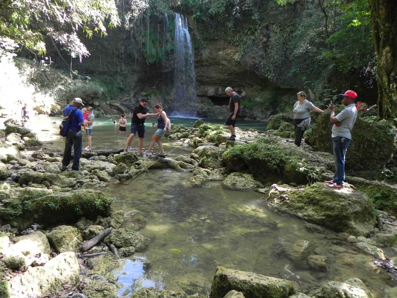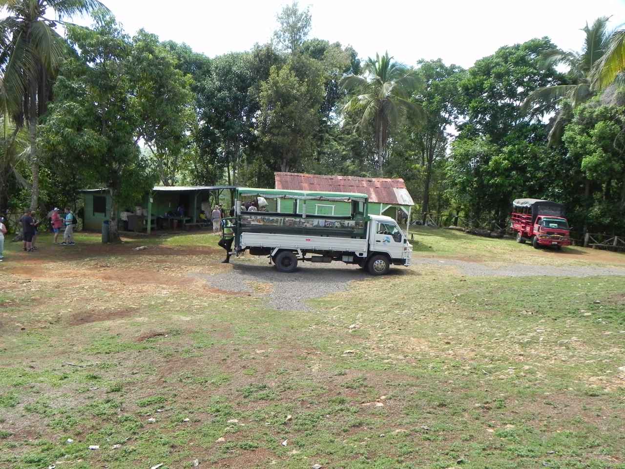 Dann geht es auch schon los mit der Busnummer 20 die wir von den Reiseleitern vor dem Theater bekommen, geht es über das Treppenhaus B zum Ausgang der sich wie immer auf Deck 2 befindet. Der Bus bringt uns zu einem Treffpunkt an einer Tankstelle, wo schon zwei offene Geländetrucks auf uns warten. Dann geht es auch schon los in Richtung Samana, jeder der Trucks hat etwa 10 Sitzplätze, unser erstes Ziel ist der Socoa-Wasserfall der sich anscheinend auf einem Privatgelände befindet. Hier wohnt eine Familie zusammen mit den Großeltern auf zwei Arealen. Es ist nichts besonderes nur ein paar Hütten aber dafür zwei neuere Motorräder. Nun gehen wir mit der Reisegruppe einige hundert Meter einen steilen und da es heute Nacht auch geregnet hat, auch rutschigen Waldweg hinunter. Nach etwa einer Viertelstunde haben wir den Wasserfall erreicht, der Fall ist ja ganz nett, aber man kann fast nirgends am Ufer stehen oder laufen. Ein paar mutige Passagiere aus unsere Gruppe stürzen sich ins Wasser, ob es sehr kalt ist, kann ich leider nicht sagen. Wir gehen nach etwa 20 Minuten den sehr steilen Weg wieder nach oben. Da es schon sehr warm ist, müssen wir schon einige Male nach Luft schnappen, bis wir das Hüttengelände wieder erreichen.