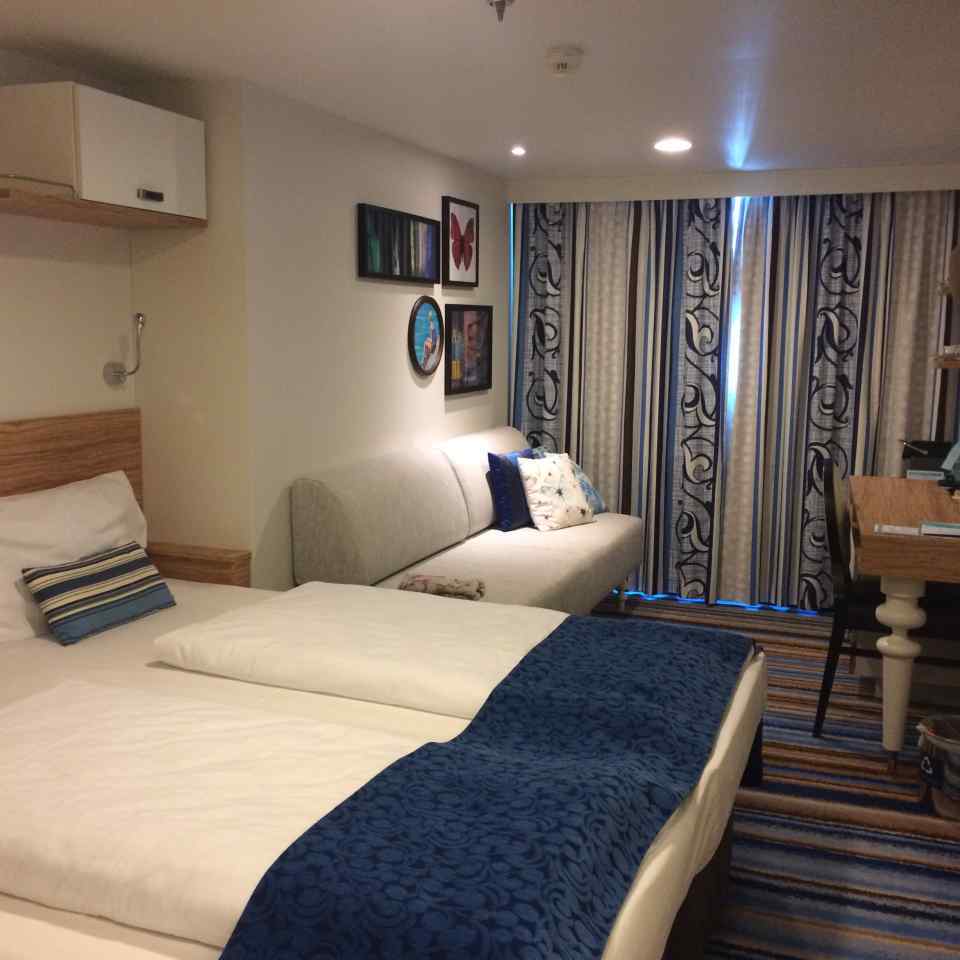 Mit dem Einchecken fertig, gehen wir durch eine weitere Halle eine kleine Anhöhe runter und betreten erstmals die mein Schiff 6. Es ist ein beeindruckendes und großes Schiff, um einiges größes als vormals die mein Schiff 1 die wir mittlererweile sehr gut kennen und schon viele Seereisen mit Ihr gemacht haben. Auf Deck 2 befindet sich der Eingang zum Schiff, alles hier schaut neu aus, das Schiff ist ja gerade eindreiviertel Jahre alt. Über den Treppenaufgang B kommen wir auf unser Deck, ein paar Meter von unserer Außenkabine 3094 entfernt befindet sich die Rezeption, der Informations sowie der Geldwechselschalter. Aber zuerst betreten wir unsere Kabine, sie ist mit 17 qm angenehm groß, gleich neben dem Eingang links befindet sich das Bad bzw. die Dusche. Danach kommt ein zweiteiliger Kleiderschrank der um die Ecke gebaut ist inclusive dem Safe. Als nächstes ein Doppelbett und danach ein kleines Sofa gleich dahinter das Außenfenster mit einem Sitzkissen belegt auf man bequem Lesen oder die Aussicht nach draußen bzw zum Meer geniesen kann.