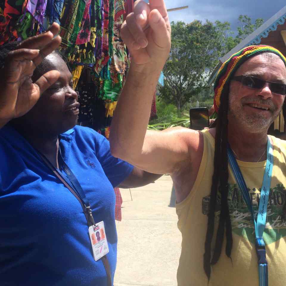 So gegen 8:00 gehen wir die paar Schritte in`s Atlantik-Restaurant zum Frühstücken, zuerst wird ein Tisch ausgesucht und der Kaffee bestellt. Danach gehen gehen wir auf Futtersuche, die Auswahl ist ja riesig, wer hier am Buffet nichts findet dem kann man nicht mehr helfen. Von dem üblichen wie verschiedene Brötchen, Marmeladen, Schinken und Käse in großer Auswahl, gebratener Speck, Spiegeleier sowie Rühreier und vieles mehr. Müsli, Obst im ganzen oder als Salat und dazu verschiedene Säfte. Nach dem Frühstück geht`s zurück auf die Kabine um unsere Morgentoilette zu vervollständigen, danach fahren wir mit dem Lift hoch auf das Pooldeck. Hier verbringen wir fast den ganzen Nachmittag teils in der Sonne, meistens aber im Schatten. Gegen 14:00 verlassen wir kurz mal das Schiff um vielleicht noch ein Souvenier von Jamaica zu finden. Vor dem kleinen Terminal befinden sich ein paar Buden die verschiedene Sachen zum Verkauf anbieten. Nach längerem Suchen entscheiden wir uns für ein schwarzgrünes Käppi von Jamaica, mein altes von Antigua ist leider nicht mehr ansprechend. An einem der vielen Verkaufsstände, die von Einheimischen Frauen geführt werden, sie sind überhaupt nicht aufdringlich, bekomme ich eine Rasta-Perücke von Bob Marley aufgesetzt. Die Verkäuferin kräht voller Freude, und Hermine macht ein Foto von mir, mit dieser Rasta-Perücke auf dem Kopf.