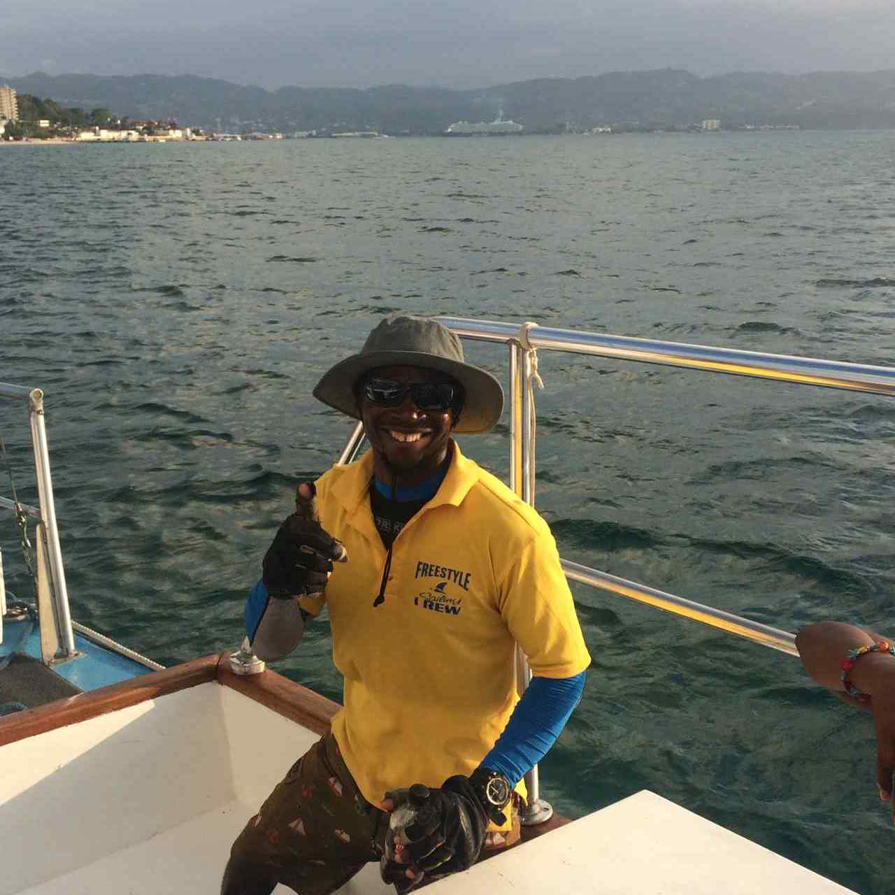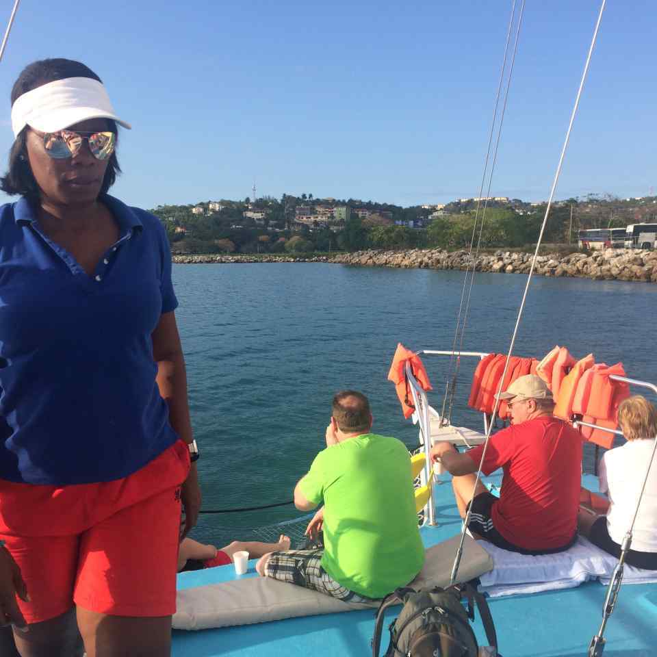 Vor dem Schiff werden wir schon erwartet und zu einem Segelkatamaran geführt, der ein paar Meter von der mein Schiff entfernt steht. Wir sind etwa 20 Personen die mit den Schuhen in der Hand das Schiff betreten. Es gibt eine kleine Sicherheits-unterweisung, dann geht`s auch schon los in die Bucht von Montego Bay. Insgesamt sind wir etwa 2 Stunden unterwegs, zuerst mit Motor später werden noch die Segel gesetzt. Zum Trinken gibt es Bier, Saft und Rumpunsch sowie kleine Kuchen und sonstiges. Dazu heiße Jamaica-Musik, der Skipper am Ruder tanzt ununterbrochen. Eine Gruppe aus dem Rheinland, zwei Frauen und zwei Männer haben schon einige Becher Rumpunsch intus, besondere eine der Damen. Sie tanzten mit nackten Füßen auf dem Deck unseres Katamarans herum. Wir hatten auch einen Kameramann vom Schiff dabei, aber der hatte mehr Arbeit mit dem Rumpunsch trinken als mit dem Filmen unseres Ausfluges. Aber es war trotzdem sehr nett, die Besatzung bestand aus vier Personen ebenfalls zwei Männer und zwei Frauen, die jüngere davon war ausgesprochen hübsch, wie man es durchaus öfters in der Karibik sehen kann. Gegen Ende unserer Ausflugsfahrt wurde es von Land her plötzlich stark diesig, binnen weniger Minuten brach ein heftiger Regenschauer auf uns herein. Nach einer Weile suchten die meisten Schutz in der Kajüte um vielleicht ihre Fotoapparate zu schützen, wiederum andere tanzten wie wild auf dem nassen Deck, der getrunkene Alkohol zeigte offensichtlich seine Wirkung.