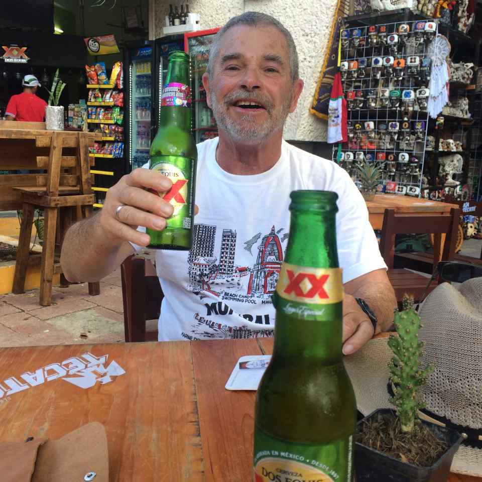 Die Ruinenstadt Tulum hat auch einen Touristischen Teil mit Souveniershops, Restaurants und vieles mehr. Der kulturelle Teil entstand im 13. bis 14. Jahrhundert und war zu dieser Zeit eine der größeren Städte der Maya-Kultur. Zusammen mit unserem Führer gehen wir durch die Anlage, er erzählt uns immer wieder über die verschiedenen Häuser und die Geschichte der Historischen Stadt. Nach einer Stunde ziehen wir uns aus der noch vorhandenen Gruppe zurück um über Holztreppen an den Strand hinunter zu gehen. Der Strand selber ist leider sehr schmal und wenig tief, das konnte man aber über die Internetbilder leider nicht erkennen. Aber wir machen das beste daraus, eine Steilwand im Rücken ziehen wir unsere Kleidung aus, Badehose und Bikini haben wir ja schon an. Zum Essen haben wir ein Lunchpaket bekommen, das ein Sandwich, Kekse, sowie zum Trinken einen Saft enthielt. Ab und zu machen wir die paar Schritte zum nahen Meer, das einen erheblichen Seegang hat, einer bleibt immer zurück bei unserem Gepäck und Wertsachen. So nach einer Stunde ziehen wir uns wieder an und machen uns auf den Weg zum Ausgang. Bei den Soveniersshops am Eingang des Parks finden wir noch einen Magneten für zu Hause. Einen bunten Sombrero in den Nationalfarben von Mexiko, die anderen Magneten sind nicht allzu ansprechend. Weiter vorne am Eingang finden wir noch eine kleine Kneipe und probieren ein Mexikanisches Bier aus, das kleine 0,33l Bier kostet ca. 4 Dollar. Da wir noch bis zur Abfahrt etwas Zeit haben, setzen wir uns ein paar Meter weiter auf eine Bank neben dem Zufahrtsweg. Hier gleich daneben ist ein Bistro oder wie man das hier nennt, der Kokosmilch-Shakès verkaufen will. Oder auch andere Fruchtsäfte, mich würde gerade ein Becher mit Ananas-Saft anmachen. Ich frage den Verkäufer was der Becher kostet, mich haut es fast um, er will 8 US Dollar dafür. Da verzichte ich doch dankend, so leicht wird auch bei uns in Deutschland das Geld nicht verdient.