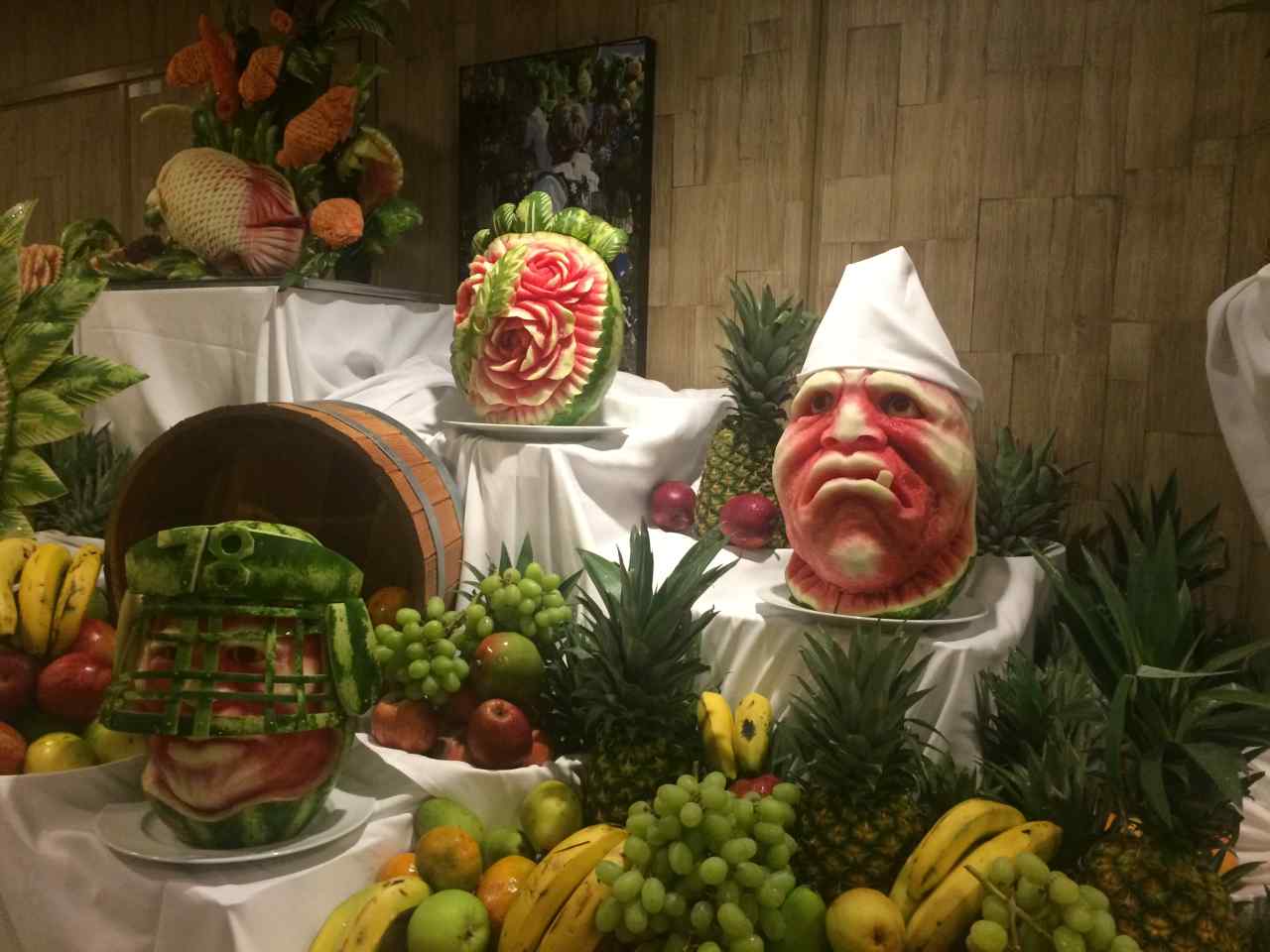 Als erstes fahren wir einige Kilometer in Richtung Pazifik hinaus, umfahren damit einen langen Leitdamm der als Schutz gegen Aufschwemmungen zum Kanal gebaut wurde. Nach ein paar Kilometer haben wir dann die Puente de las Américas eine vierspurige Brücke erreicht, die Nord und Südamerika verbindet, bevor es dann in die Schleusen geht. Wir fahren hinter der Mattheos I einem Containerschiff mit geschätzten 200 mt. Länge durch die Miraflores Schleusen und im Anschluß durch die Pedro Miguel Schleusen. Die Schleusenkammern waren minimal breiter als unser Vorderschiff, die Mattheos I. Die Tore der alten Schleusenkammern waren wie Flügeltüren angeordnet die zuklappen. Die Tore der neuen Schleusenanlagen die seit Juni 2016 in Betrieb sind, dagegen sind als Schiebetore konzipiert. Die Wasser-befüllung der einzelnen Kammern ging wahnsinnig schnell voran. Interressant waren auch die Treidelloks die vier bis 8 Lokomotiven, wo die einzelnen Schiffe in die Kammern ziehen bzw. stabilisieren. Leider ist heute nicht viel los im Kanal nur vereinzelt kommt mal ein Schiff vorbei. Auf der Strecke begegnet uns ein Autotransporter von Toyota und dahinter noch ein altes Containerschiff. Um 12:00 steigen wir leider in Gamboa wieder aus, die Fahrt durch den Gatunsee wird uns nicht gegönnt. Mit unserem Bus geht es wieder zurück nach Colon an der Karibikseite, das wir nach gut einer Stunde erreichen. Jetzt am Tag sehen wir in welchem Zustand die Stadt Colon ist, baufällige Häuser, in den Gassen überall Müll. Es ist die dreckigste Stadt auf unserer Reise. In der Stadt herrschte ein Verkehrschaos, eine dreiviertel Stunde brauchen wir, bis unser Schiff endlich erreicht ist. Es ist jetzt Zeit zum Mittagessen, wir sind anschließend in das Ankelmann-Restaurant hinauf gegangen und schauen uns nach dem angebotenen Essen um. Dann entschieden wir uns für eine Brotzeit, es gibt hier ein Holzofenbrot mit Griebenschmalz das vorzüglich schmeckt. Nach einer Weile erkennen wir durch die Fenster vom Restaurant, das in der Stadt Colon ein Haus brennt. Am Nachmittag gehen wir noch auf das Pooldeck zum Ausruhen und ein paar Strawberry Kiss trinken, um 16:30 ist aber schon wieder Abfahrt nach Cartagena in Kolumbien. Unser heutiges Abendessen findet wieder im Ankelmann statt, was ich gegessen habe weiß ich aber nicht mehr. Mein schönes neues Hemd habe ich beim Getränke holen mit einem Glas Rotwein bekleckert. Somit mußte ich also zurück in die Kabine und mich umziehen und natürlich versuchen die Rotweinflecken mit warmen Wasser zu entfernen. Als ich wieder ins Restaurant zurück bin, habe ich unser Handy mitgenommen um ein paar Bilder zu machen. Heute sind ein paar schöne geschnitze Figuren aus Melonen am Restauranteingang aufgestellt.