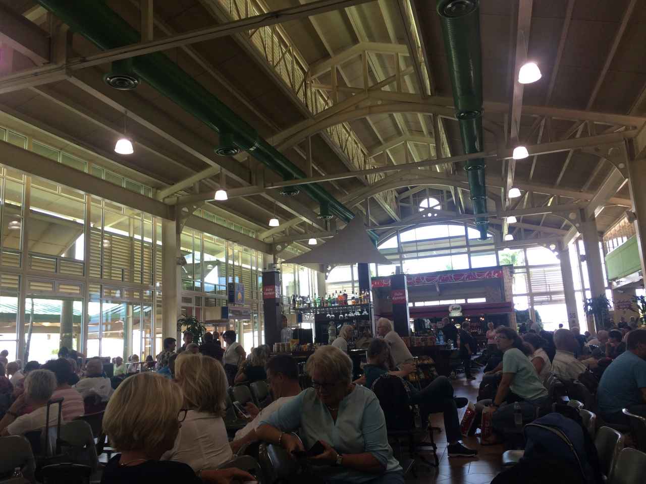 Eine lange Menschenschlange von der mein Schiff 6 wartet hier schon auf das Einschecken, wir mußten dann auf Strumpfsocken durch die Kontrolle gehen. Das kam mir sehr bekannt vor, bei unserem ersten Karibikurlaub in 2013 durften wir in Barbados ebenfalls unsere Schuhe ausziehen. Es waren anscheinend außer den Fluggästen von München auch Düsseldorfer die hier auf den Abflug warteten. Kurz vor unserm Abflug kamen plötzlich kleine Rußpartikel durch die offene Wartehalle geflogen, zuerst dachte ich , sie kommen von den 2 Flugzeugen die gerade gelandet waren. Später erzählte unser Flugkapitän das hier in der Nähe Zuckerrohrfelder abgebrannt werden, und die Rußpartikel durch die Luft bis zum Flughafen getragen werden.