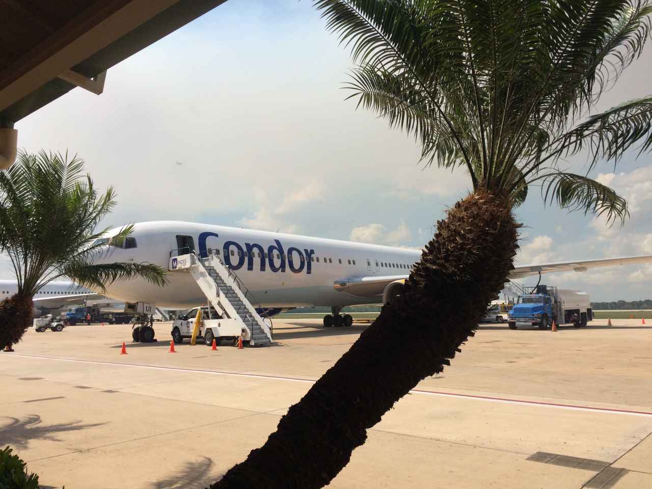 Um 15:00 war es dann endlich soweit, daß wir die Abflughalle verlassen durften, aber gleich darauf mußten wir auf dem Flugfeld nochmals kurz warten, bis unser Flugzeug endlich frei gegeben wurde. Um 15:45 scheint es dann endlich los zu gehen, unser Heimflug nach München mit der Condor-Flug-nummer 3775 in einer Boeing 737-300.