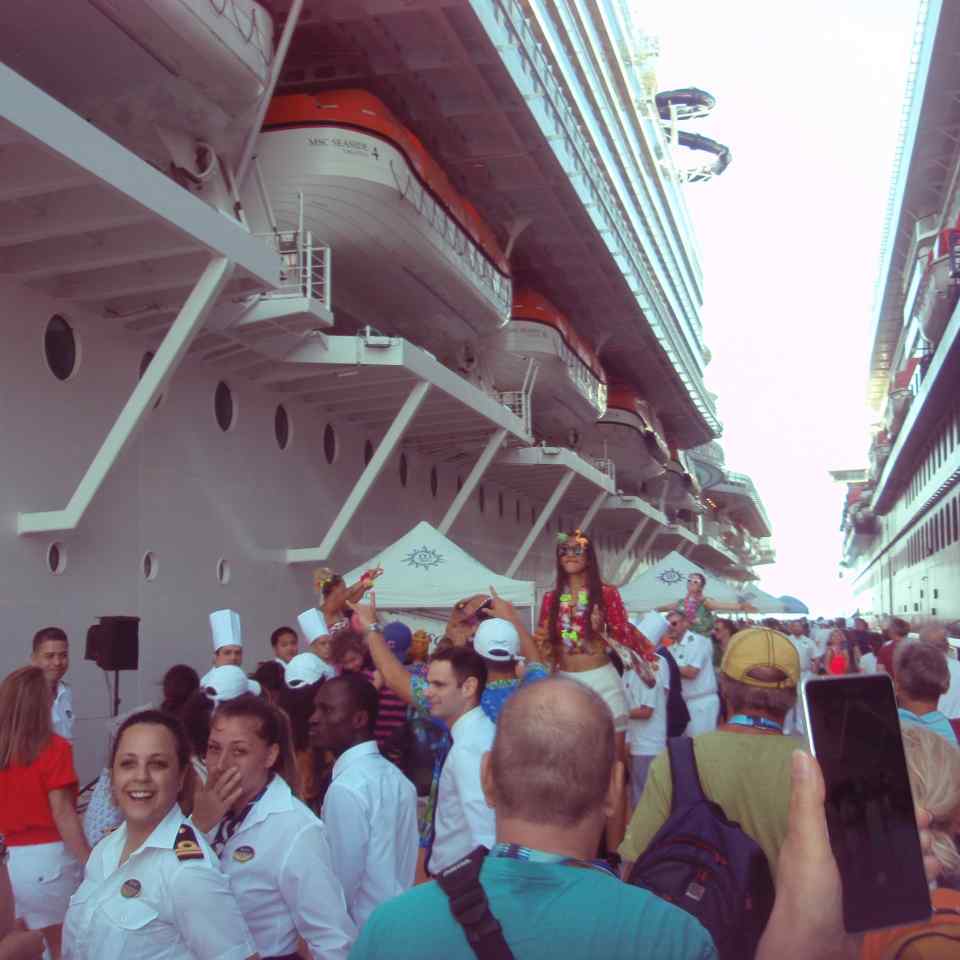 Es ist Zeit, wir müssen zum Bus zurück, der Fahrer erwartet uns mit feuchten kleinen Handtüchern zum Erfrischen, und dazu eine Flasche mit Wasser. Nachdem wir dann alle in den Bus eingestiegen sind, kommt plötzlich der Busfahrer mit dem Reiseleiter in den Bus. Der Busfahrer hat wohl seine Tüchlein gezählt, die wir nach dem Benutzen wieder in einen Korb gelegt haben. Es fehlen ihm zwei der Tücher, ein Ehepaar zwei Reihen hinter uns hat die 2 Tücher säuberlich zusammen gelegt und in die eigene Tasche gesteckt. War wohl etwas peinlich für die beiden, das zu zugeben. Die Tücher waren zur Erfrischung und nicht als Geschenk gedacht. Die Rückfahrt zur Insel Cozumel gestaltet sich noch etwas spannender als auf der Hinfahrt, wir hatten einen großen Seegang mit Wellen von drei bis vier Metern. Unser Katamaran schwankte auch seitlich immer wieder einige Meter rauf und runter. Das war bestimmt ein Spaß für einige unserer Landratten. Nach einer Stunde war die Überfahrt vorbei, im Hafen von Cozumel war das Wasser wieder ruhig. Als wir gegen 16:00 aus unserer Fähre ausstiegen und zu unserem Schiff hinüber gehen, kommen wir an der MSC Seaside vorbei die neben uns an der Außenpier liegt. Sie empfängt Ihre zurück kommenden Gäste mit lauter Musik und Tanz vor dem Schiff, es sind halt Italiener, aber toll.