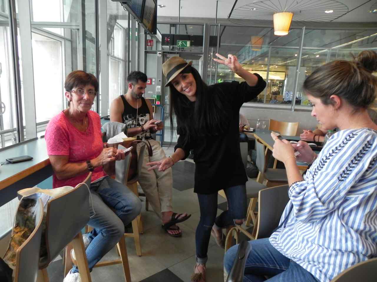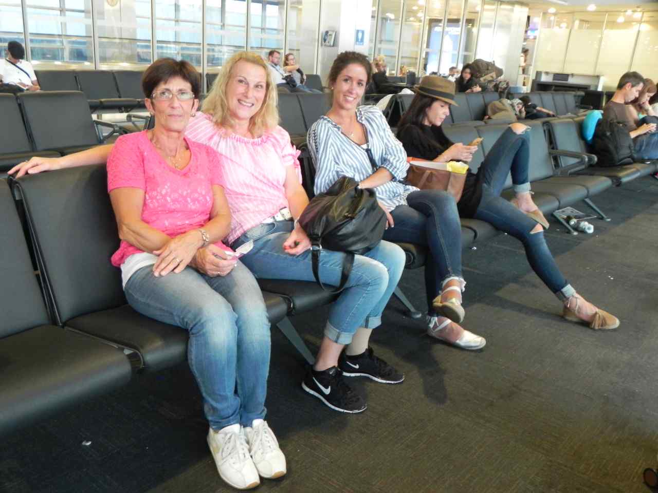 Um 13:00 stehen wir schon an der Haustüre des künftigen Hochzeitpaares, alle sind gut gelaunt, so kann unsere Reise beginnen. Nach ein paar Fotos vor der Haustüre kommen auch schon die beiden Taxis, die uns zum Airport in Stuttgart bringen werden. Der Weg bis dahin ist ja nicht weit, so werden wir schon am Eingang des Terminals von den Schwiegereltern Dagmar und Klaus begrüßt. Gemeinsam gehen wir nun im Terminal 3 zum Check-In, um uns hier einzuchecken, und geben auch gleich unsere Koffer ab. Danach gehen wir in den ersten Stock zu Gate 312 hoch. Einige von uns haben auch schon wieder Hunger und Durst, da bis zu unserem Abflug noch etwas Zeit ist. Das Bistro ist gleich daneben, Schwiegervater Klaus holt uns beiden ein Glas Weizenbier, und die künftige Braut Raphaela bringt uns noch ein paar Brezeln zum Knabbern vorbei. So verbringen wir die restliche Zeit bis zum Abflug in fröhlicher Runde. Kurz vor der Abfahrtszeit wechseln wir zu unserem Abflugsgate, hier bekommt Raphaela noch von Ihrer Schwester ein T-Shirt von Kevin („die Minions“) geschenkt, da Sie ja offensichtlich ein großer Fan von dieser Kunstfigur ist.
