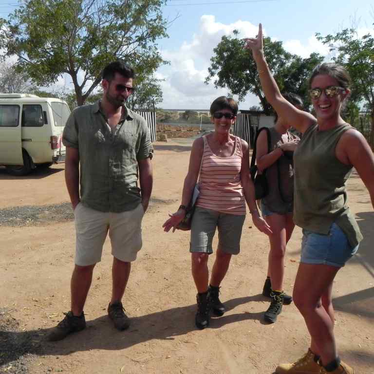 Kurz nach 5:00 weckt uns schon ein Boy vom Hotel, er klopft an allen Zimmertüren unserer Reisegruppe. Meine Frau Hermine und ich vergewissern uns, ob Dagmar und Klaus im Zimmer über uns auch schon auf den Beinen sind. Im Speisesaal liegen Breakfast-Pakete für uns alle bereit. Tochter Alexandra und Schwiegersohn Vito müssen wir aber noch aus dem Schlaf klingeln. Um Punkt 6:00 stehen wir dann schon gemeinsam vor der Rezeption, auf uns warten zwei große Toyota-Landcruiser mit Ihren Fahrern. Jedes von Ihnen hat Platz für sieben Fahrgäste, derart ausgestattet sind die Safari-Urlauber in der Regel kaum, die meisten Urlauber müssen bis zu 9 Personen in Kleinbussen von Mitsubishi und anderen Herstellern ihre Safari überstehen. Dagmar und und Klaus sowie Hermine und ich, die Alten also, besteigen eines der tollen Gefährte. Und die Jungen, das Brautpaar Ela & Chris sowie Alex & Vito nehmen den anderen Jeep, und schon geht es los Richtung Westen hinaus in die Savanne. Die ersten Kilometer führen uns durch Mombasa, deren Straßen mit riesigen Schlaglöchern gesegnet sind.