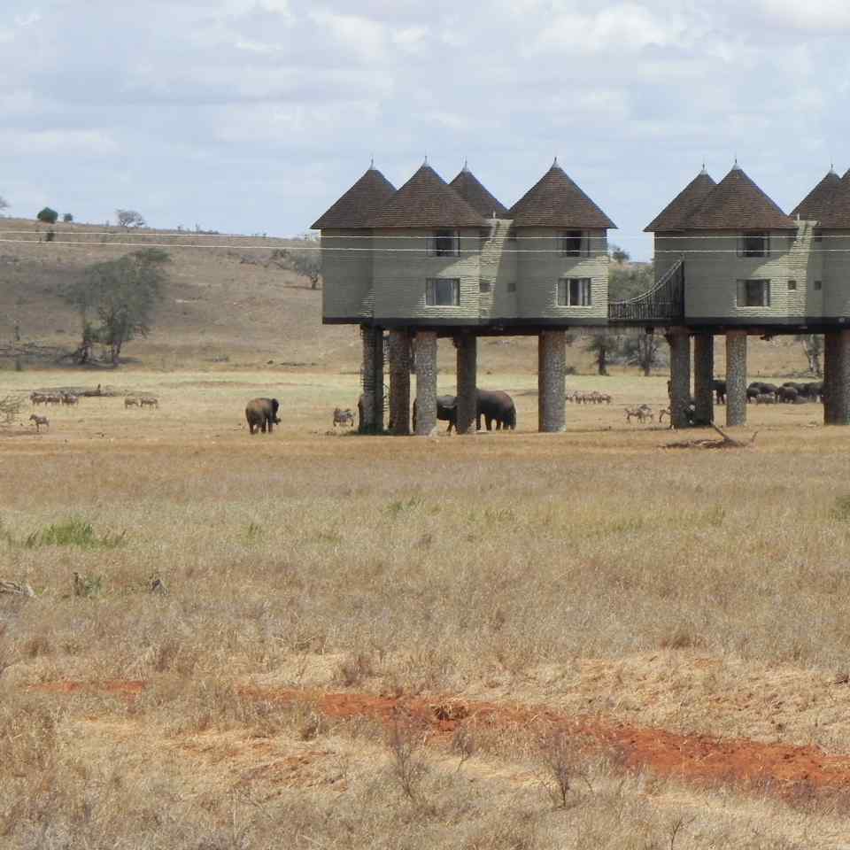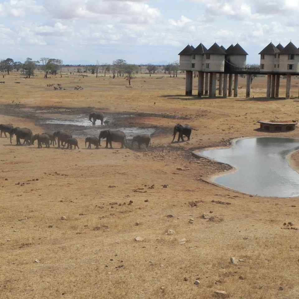 Man kann sich das etwa so vorstellen, das rustikale Zifferblatt einer Uhr, der große Zeiger steht auf zwölf Uhr, und der kleine etwa auf vier Uhr. An jedem Zeiger befinden sich Gruppen von Häusern, die auf etwa geschätzt 8 -10 Meter hohen Säulen stehen. Jede Gruppe besteht aus 4 Häusern. die doppelstöckig über eine Treppe verbunden sind, und die untereinander über einen Laufsteg erreichbar sind. Im Zentrum des Ganzen, also in der Nabe dieser Uhr befindet sich die Rezeption, der Speisesaal, eine Cafeteria und im obersten Stockwerk auch noch eine große Bar. Von diesem Zentrum aus sind die Zeiger, also die einzelnen Häusergruppen zu erreichen. Um das Ganze noch abzurunden, als wir hier ankommen, befinden sich bestimmt mehr als 30 Elefanten und auch Zebras hier in der Anlage. Der Erbauer dieses Hotels in der Afrikanischen Savanne hat direkt am Haus eine Wasserstelle geschaffen. So kann man in maximaler Entfernung von geschätzten 7 – 8 Metern die Elefanten beim Trinken beobachten. Als erstes bringen wir unser Reisegepäck in unseren Zimmern unter, das Zimmer ist kreisrund, so etwa 8 Meter im Durchmesser. Ein riesengroßes Bett mit einem Moskitonetz darüber, dahinter eine Wand wo sich das Badezimmer und die Toilette befinden. Ein eingebauter Kleiderschrank, zwei Sitzgelegenheiten und ein kleiner Sekretär. Und natürlich Fenster zum Öffnen, unter uns sind die Elefanten zu sehen die ganz nah vorbei zum Wasser gehen.