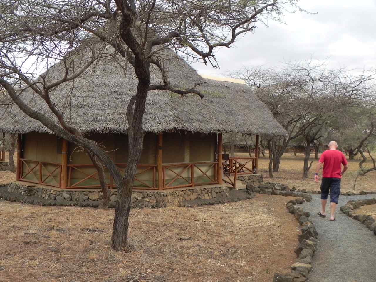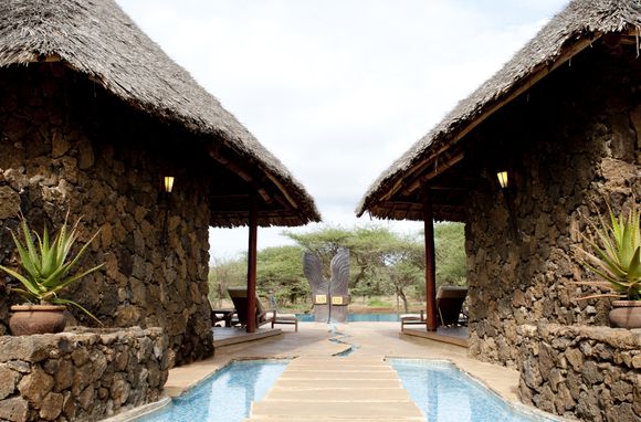 Wir werden am Eingang von zwei Massai-Kriegern wie auch von den Mitarbeitern und der Guast Relations Managerin Manja begrüßt, und bekommen als Willkommensgruß ein Glas Tee gereicht. Das Zentralgebäude dieser Safari-Lodge mit seiner offenen Lounge und dem ebenfalls offenen Restaurantbereich bietet ein schönes Bild. Als erstes müssen wir unsere Anmelde-Formulare ausfüllen, und werden von einem der Massai anschließend zu unseren Domizil für die nächsten 2 Tage gebracht.