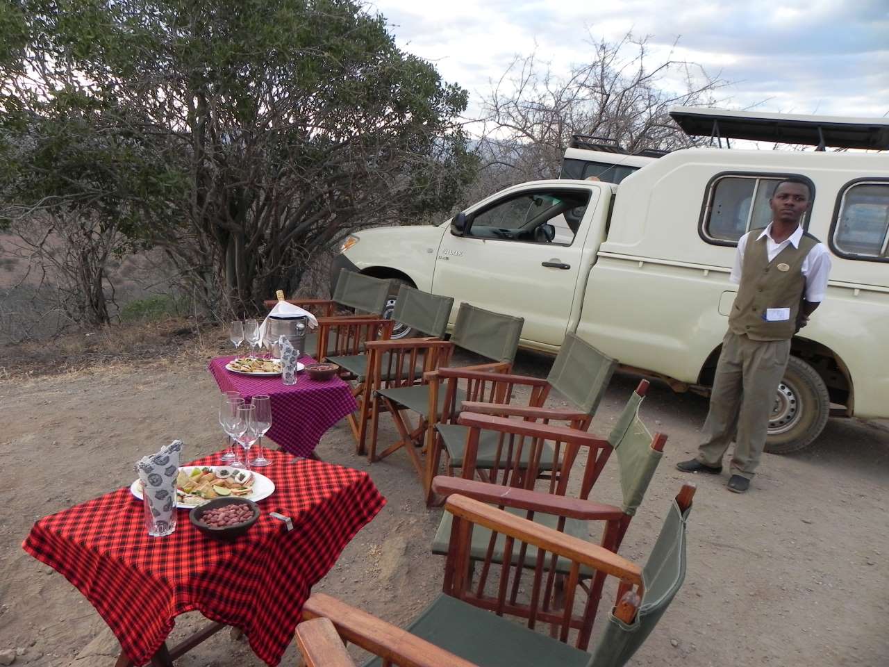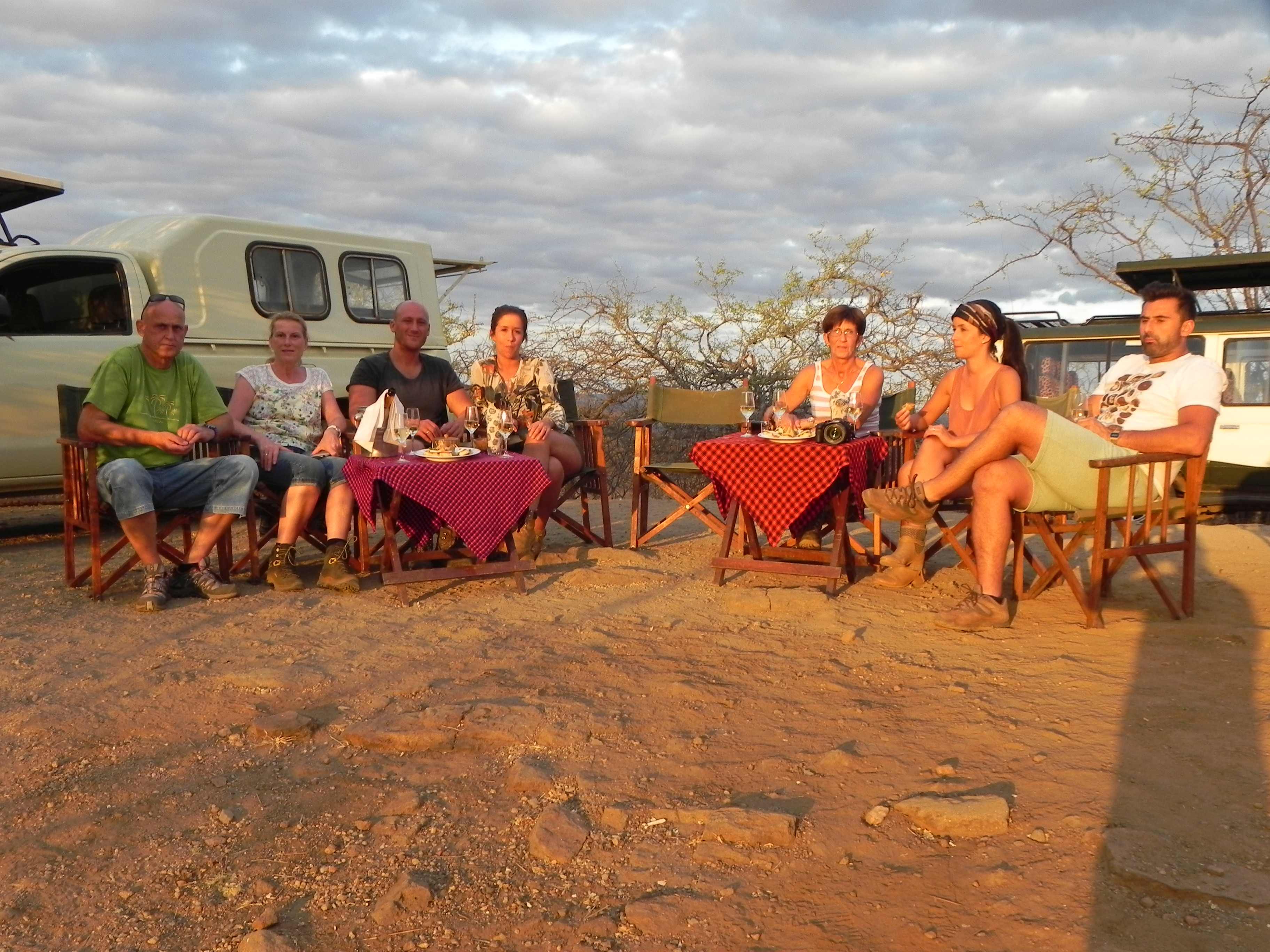 Um ca.17:00 machen wir mit unseren Jeeps einen letzten Ausflug, der uns zum Poacher`s Lookout führen soll, wir brauchen dazu bestimmt eine dreiviertel Stunde. Der Weg geht wirklich über Stock und Stein, aber mit Afrikanischen Verhältnissen ein Schlagloch nach dem anderen, bis wir die Anhöhe erreicht haben. Hier dann die Überraschung, es standen schon zwei Boys von unserem Camp mit Ihren Fahrzeugen hier oben und hatten Stühle und zwei kleine Tische für uns aufgestellt. Es gab Knabberzeug und zwei Flaschen Sekt zum Trinken. Wir machten ein paar Fotos von unserer Runde und dem grandiosen Ausblick von hier Oben. Weiter hinten war ein weiteres Paar mit Ihren Gästen da, aber das sollte uns nicht weiter stören.