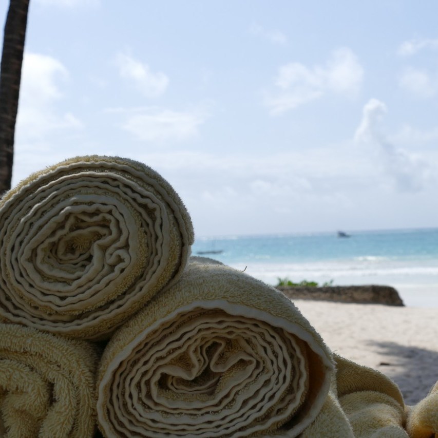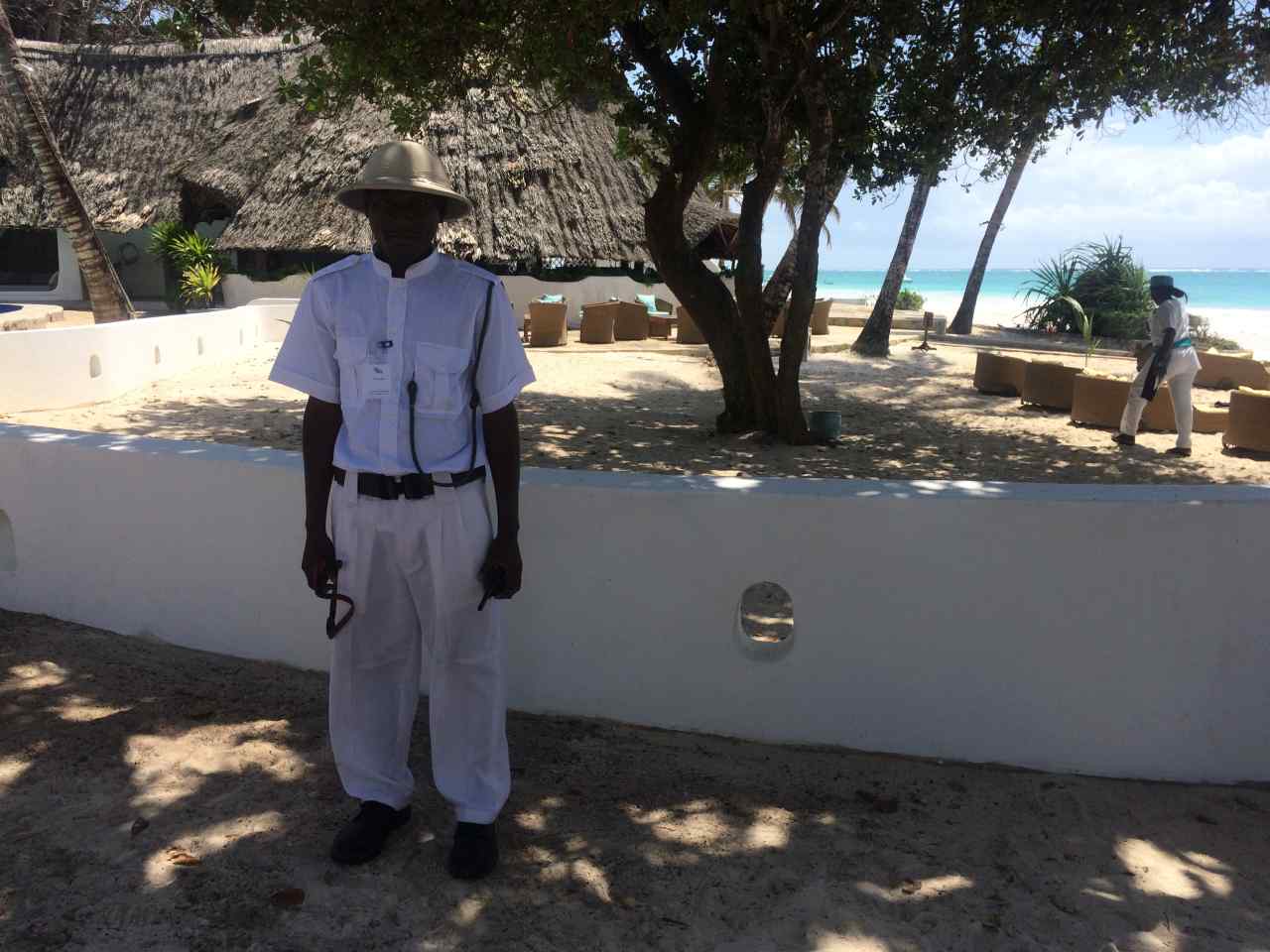 So gegen 16:00 haben wir unser letztes Ziel den Ocean-Village-Club am Diani Beach erreicht, alle sind froh endlich da zu sein. In einer Empfangslobby am Eingang werden wir von Mitarbeiterinnen begrüßt und bekommen zugleich ein Glas Tee zur Erfrischung. Wenig später gehen wir in die einzelnen Zimmer oder Suiten, die um einen grünen Park mit vielen Blumen, Bäumen und Palmen gruppiert sind. Wir sind alle in einem Teil der wunderschönen Anlage untergebracht, in unserer Mitte wohnt das Brautpaar. Sie haben sich eine Suite ausgesucht, wo inmitten der Terrasse ein Baum hochragt. Die Zimmersuiten sind sehr groß ca. 40-50 qm. Wenn man von der Terrasse den Raum betritt befindet sich auf der rechten Seite eine nette Sitzgelegenheit und dahinter ein riesiges Himmelbett, natürlich mit einem Moskitonetz. Auf der linken Seite befindet sich eine Kofferablage, ein Schreibtisch, Sidebord und dahinter ein großer Kleiderschrank mit Safe. Dann geht es durch eine Türe in den Waschraum, der wiederum unterteilt ist, in der Mitte ein großer Waschtisch mit 2 Keramikbecken. Links davon hinter einer Mauer die Toilette, und auf der rechten Seite eine begehbare Dusche. Und als Highlight eine freistehende Badewanne, von der man in den Wohn-raum schauen kann, wenn der Vorhang auf die Seite geschoben wird.
