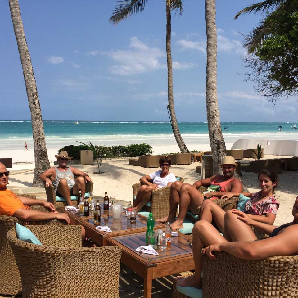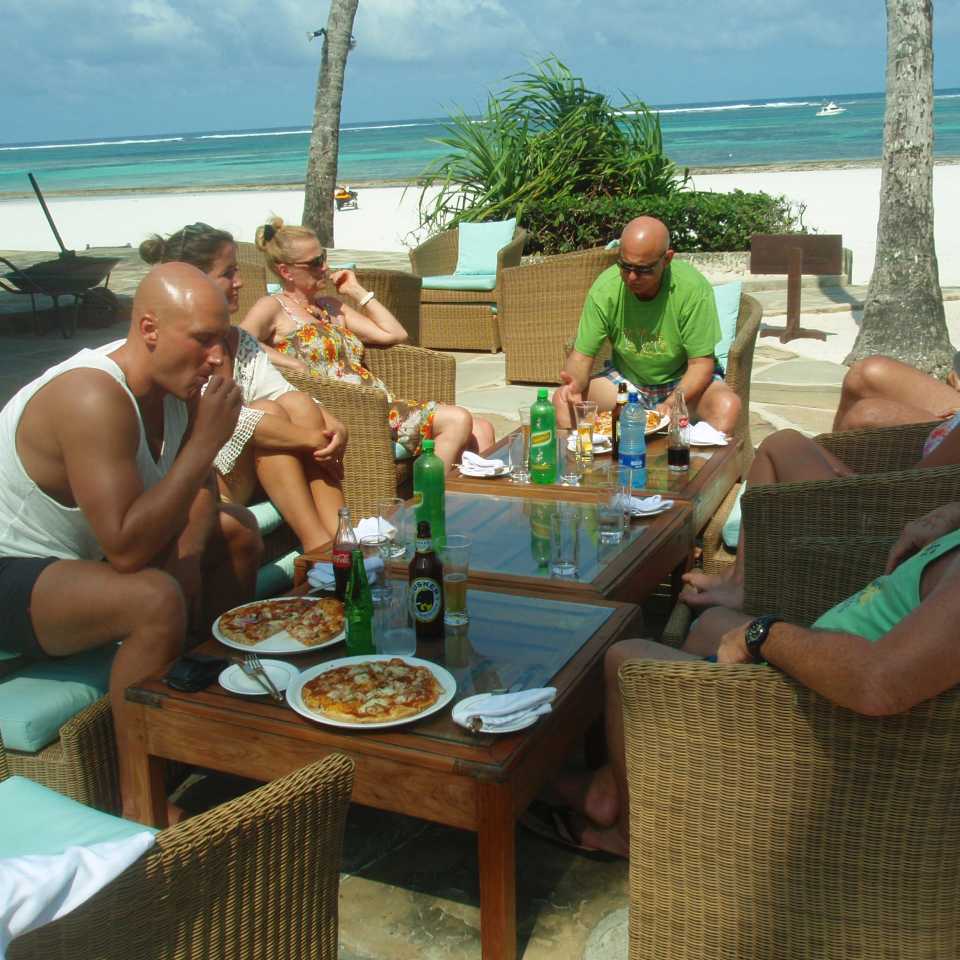 Ein Ober bringt uns die Speisekarte, es gibt Pizzen, diverse Würstchen und Lobster, für den sich dann Alexandra, Vito und auch Chris entscheiden. Die anderen bestellen sich eine der Pizzen, Dagmar und Klaus etwas mit sehr scharfem Zubehör, wir anderen eine normale Pizza. Meine Pizza ist mit Pilzen ausgestattet und schmeckt eigentlich nicht schlecht für afrikanische Verhältnisse. Zum Trinken bestellen sich Klaus und ich ein Tusker-Bier, die anderen Cola und Wasser. Nach unserem Mittagessen gehen wir wieder auf unsere Liegen zurück, die einen pennen, die anderen gehen am Strand spazieren. Es gibt hier einheimische Händler, die mit Ihren Holzwaren direkt vor unserem Resort stehen, aber sie gehen nicht die Treppenstufen hoch zu den Hotelgästen. Anscheinend wurde das Ihnen nachdrücklich verboten, und sie halten sich daran. auch direkt am Strand, also ein paar Meter weiter unten, hält sich die Anmache der Händler absolut in Grenzen. Irgendwann später trinken wir noch einen Kaffee, und dann kommt auch schon der Abend. Den wir nach dem Abendessen dann alle gemeinsam bei guter Laune an der Bar verbringen.