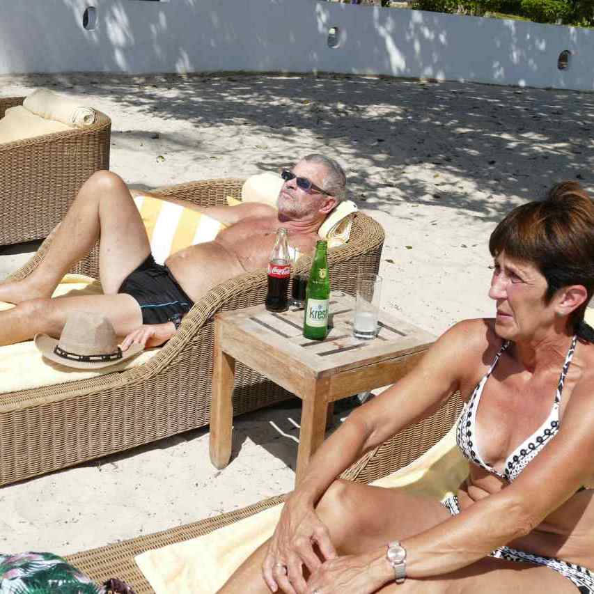 Unsere Vorbereitungen zur geplanten Hochzeits-Zeremonie beginnen jetzt. Die Braut wird von ihrer Schwester Alexandra begleitet und unterstützt, da werden die Haare gemacht, es wird geschminkt und alles für die große Stunde gerichtet. Um 18:30 ist es dann soweit, alle sind fertig und versammeln sich am Bungalow unseres Brautpaares. Ein Kellner bringt uns noch Getränke, für Dagmar einen Fruchtcocktail, Schwieger-vater Klaus hat sich ein Glas Gin bestellt, die meisten von uns trinken einen Cuba Libre oder zumindest etwas mit Cola, wie auf den Bildern zu erkennen ist.