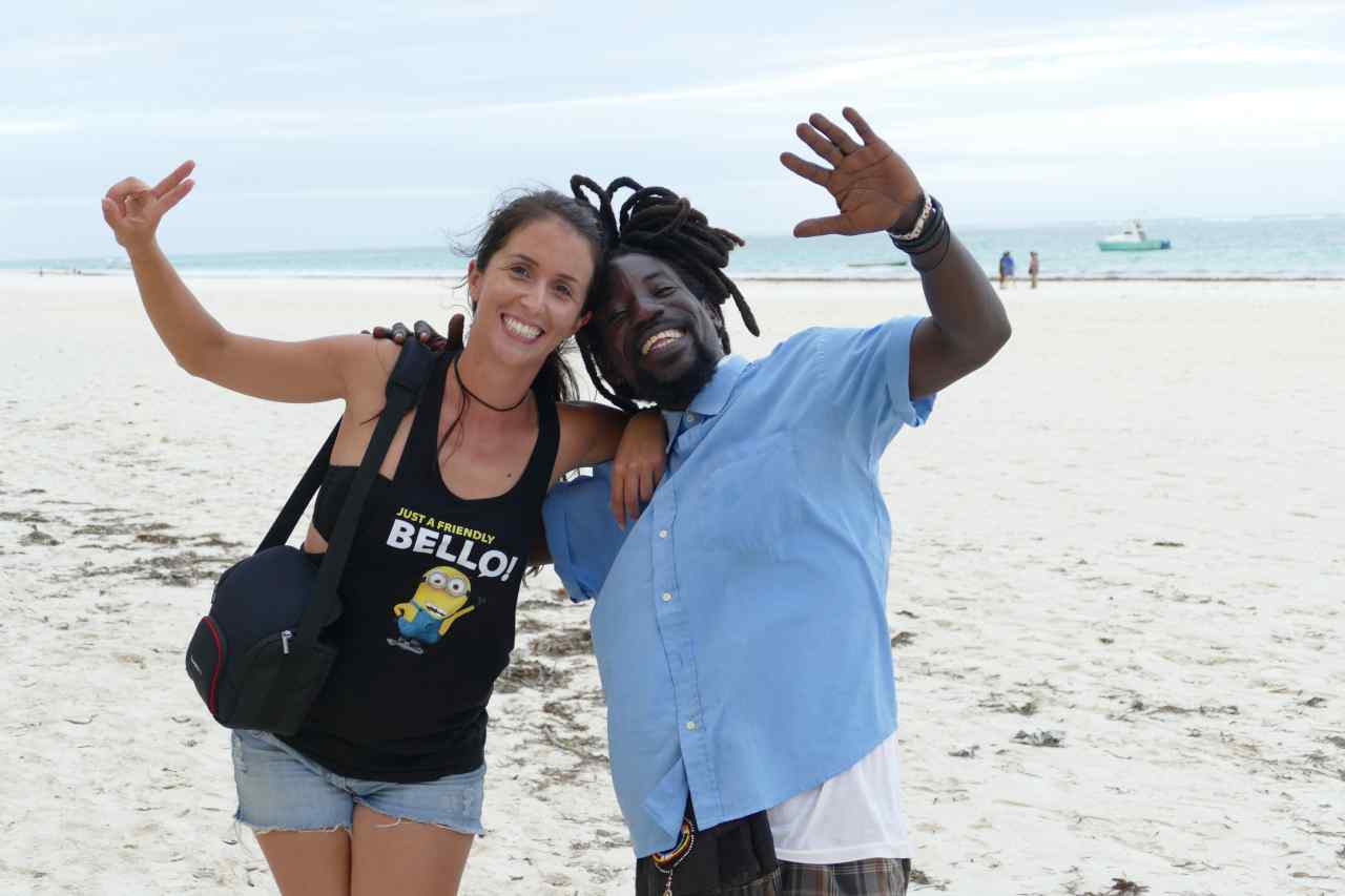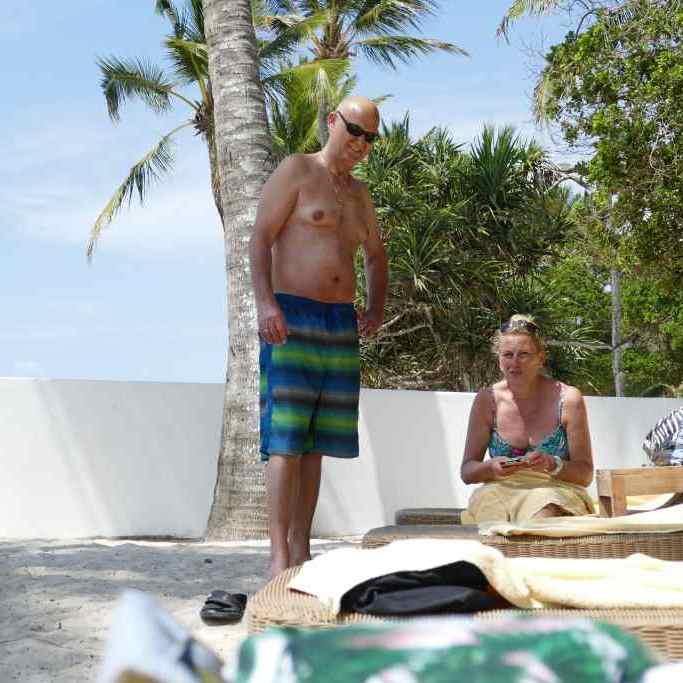 Beim Durchgang durch eine dieser Bars kommt man zu einer netten Poollandschaft mit einer kleinen Rutsche. Meine Töchter Raphaela und Alexandra können einfach nicht widerstehen und machen ein paar Rutschfahrten in den netten kleinen Pool. Wenn man durch den Garten geht, sieht man überall verstreut unsere kleine Reisetruppe auf ihren Liegen schlafen, der Flug war halt doch sehr anstrengend. Was auffällt es gibt hier Badeliegen auf denen sich Europäische Frauen oder auch Männer räkeln und daneben sitzen Einheimische Männer und Frauen. Offensichtlich sind das gesuchte Urlaubsbekanntschaften. Die gleiche Situation erleben wir bei unserem Aufenthalt am Ende unserer Reise in unserem Strandhotel. Direkt an der Pool-Landschaft, ein paar Treppenstufen hinunter, beginnt schon der Strand und dahinter der Indische Ozean mit seiner unendlichen Weite. Hier am Strand sind einige Händler mit Ihren Waren und Souvenirs unterwegs, unsere Hotelanlage betreten sie aber nicht.