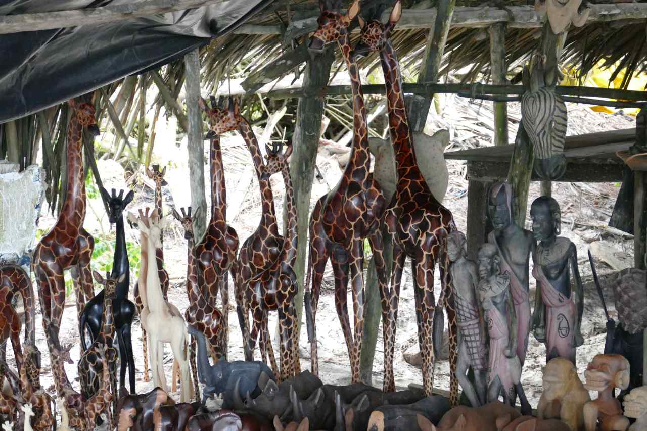 Später gehen wir mit dem Brautpaar und seinen Eltern den Sandstrand aufwärts. Ein paar hundert Meter entfernt befindet sich eine größere Hütte die auch direkt am Strand ist. Man kann schöne Holzfiguren kaufen, alle Tiere die es in Afrika gibt. Auch Massai`s gibt es hier in Holz, und in vielen Größen, von einem halben Meter großen Elefanten bis zur Mini-Antilope. Man muss halt handeln mit den Jungs. Klaus findet ein großes Nashorn und einen wunderschönen Elefanten, den will er Matze schenken, wie wir hörten. Auch Ela und Chris finden einen schönen Elefanten aus Rosenholz, er ist nicht lasiert wie sonst üblich, die Oberfläche ist samtig. Er ist ca. 30 cm hoch und schaut wirklich toll aus.