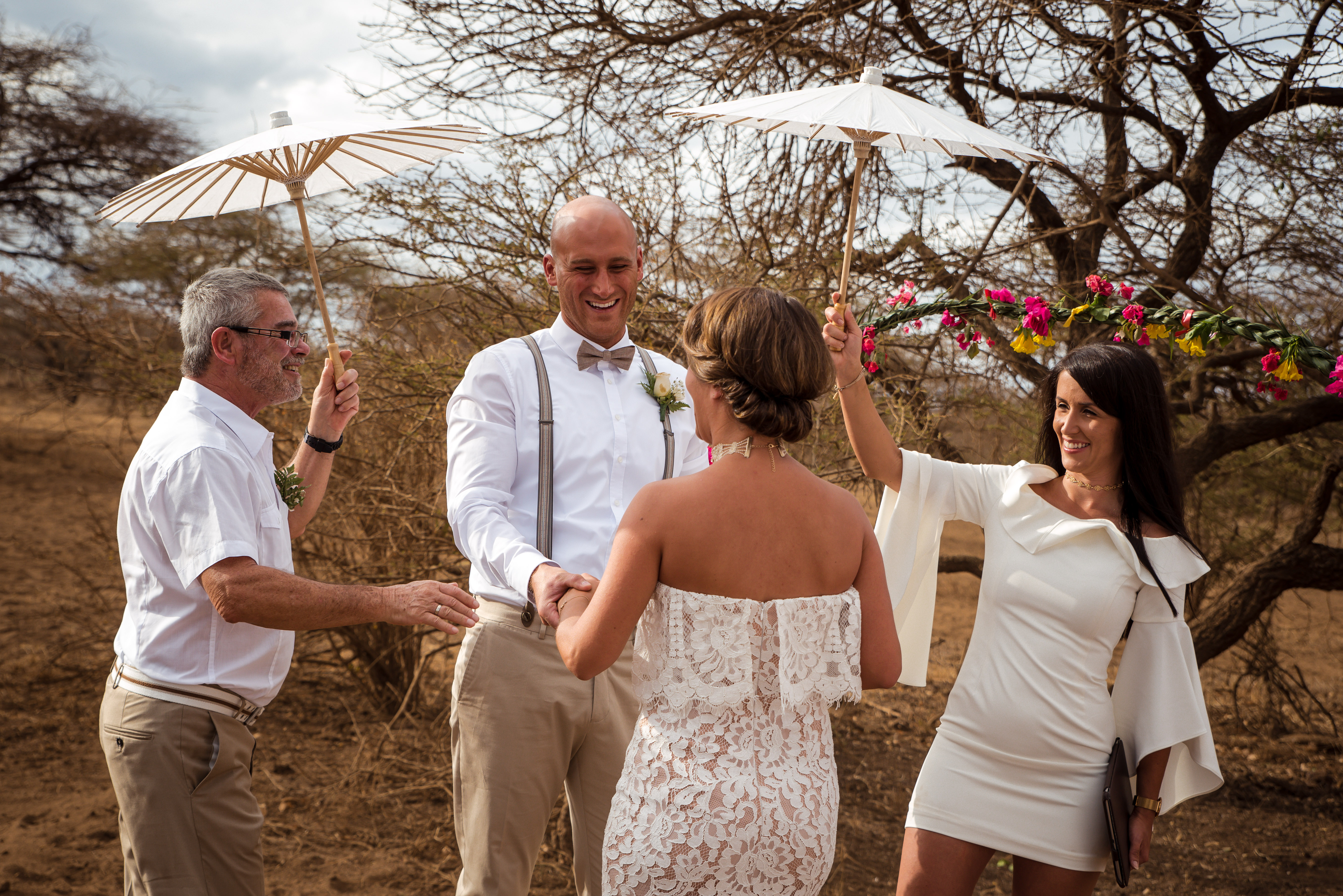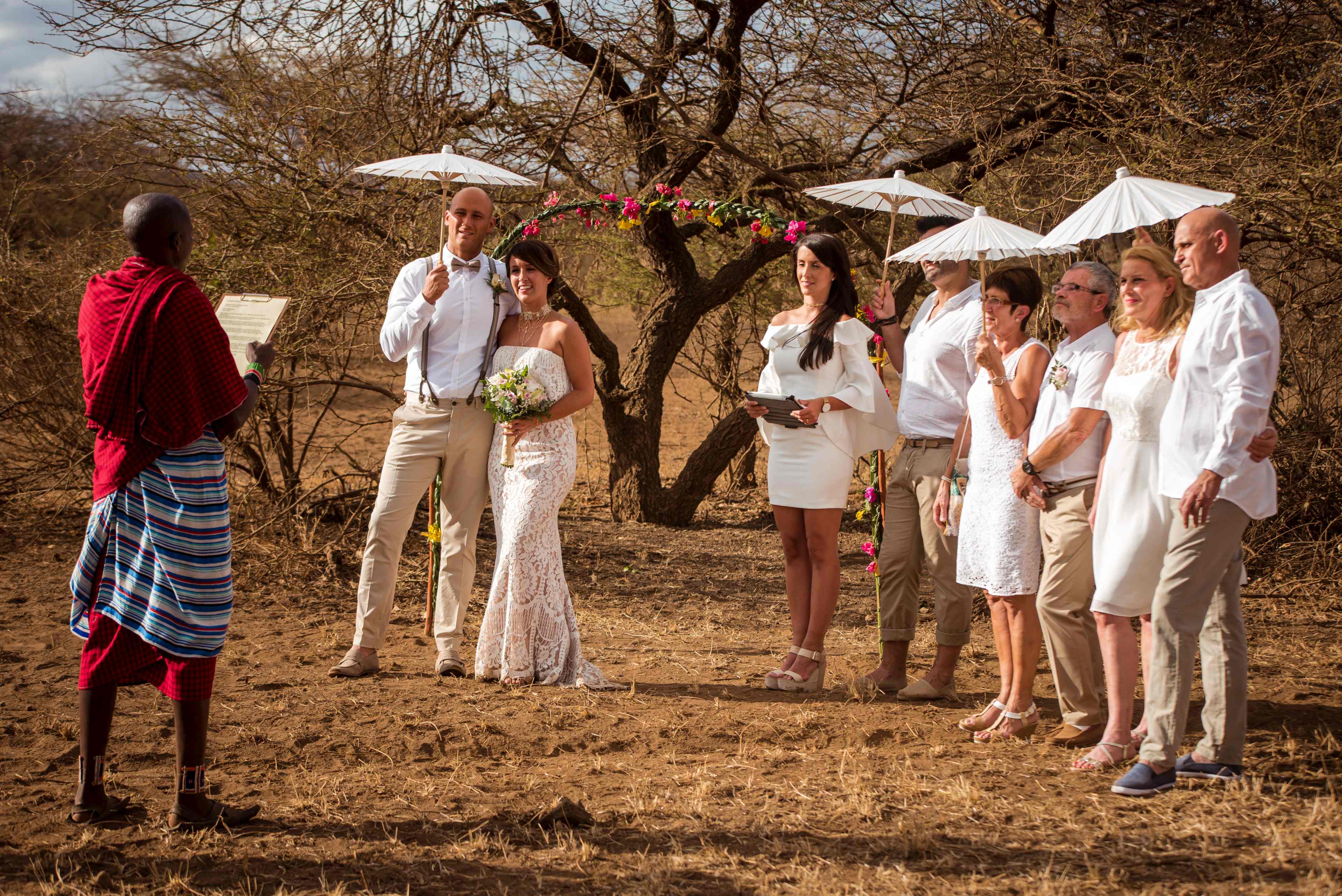Wir sind alle Top gestylt, zumindest von den Knöcheln bis zum Oberteil. An den Füßen haben wir alle unsere Wanderschuhe an, wir müssen ja noch ein paar hundert Meter in der Savanne wandern, wo dann an einem Festplatz die Trauung stattfinden wird. In hohen Schuhen läuft`s sich aber schlecht, vor den wilden Tieren davon, die uns hier draußen ohne weiteres begegnen können. Als wir um 18:45 losgehen, begleiten uns vier Massai-Krieger mit ihren langen Speeren bewaffnet zum Zeremonie-Platz, wo uns schon Musik aus einem Kassetten-Rekorder empfängt. Mit einem weißen Sonnen-schirm bestückt, geleite ich als Brautvater meine Raphaela zum Platz und übergebe sie anschließend an Ihren zukünftigen Ehemann Chris der von seiner Schwägerin Alexandra begleitet wird. Die übrigen Familien-Mitglieder folgen im Anschluss. Unsere Gastgeberin Manja hält eine kurze Begrüßungsrede, bevor Harrison einer der Massai-Krieger seine Hochzeitsansprache in englischer Sprache abhält. Als Schwester der Braut hält auch Alexandra eine kleine Ansprache.