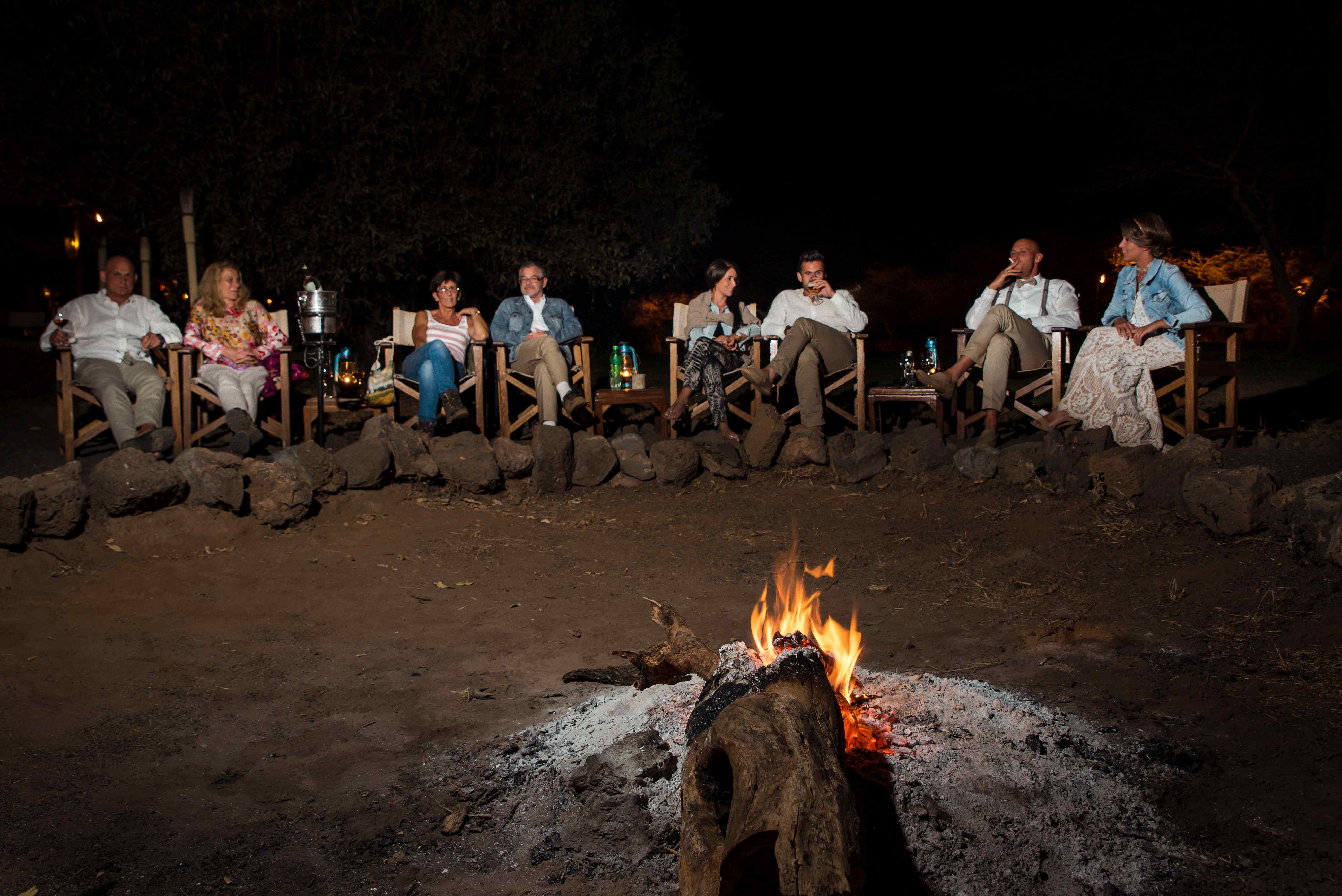 Kurz vor acht Uhr werden wir im „Out of Africa“ Restaurant der Safari–Lodge zum Hochzeitsmenü erwartet, unsere Tafel ist unterhalb der Terrasse gedeckt, mit einem sagenhaften Ausblick auf die Savanne vor uns, und den wilden Tieren, die wir in den nächsten Stunden noch sehen werden. Das Abendessen selber kann ich leider nicht so genießen, weil ich im Laufe des Tages vergessen habe meine Medikamente pünktlich zu nehmen, und dem entsprechende Probleme mit dem Magen hatte. Etwas später gingen wir noch zum Lagerfeuer, das im Kreis mit Stühlen bestückt war. Von hier konnte man wunderbar ein beleuchtetes Wasserloch einsehen. Ein paar Plätze waren für uns reserviert, wo die Tiere, die jetzt in der Nacht aktiv wurden, gut zu beobachten waren. Dieses Vergnügen konnte das Brautpaar kaum genießen, da sie mit Ihren Fotografen ein Fotoshooting in allen Räumen der Lodge machen mussten.