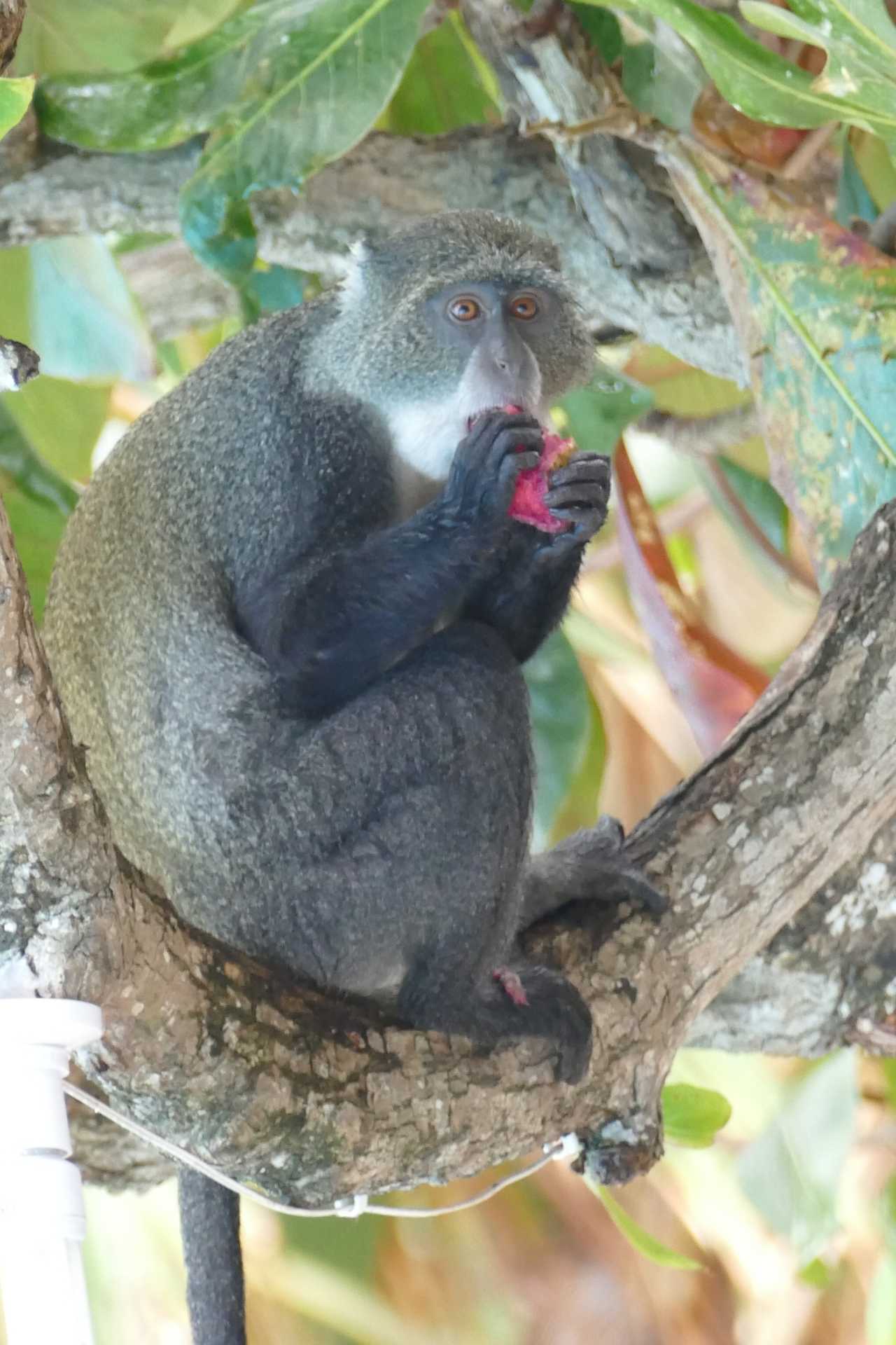 Auch heute Nacht haben alle gut geschlafen, die Klimaanlagen bringen ja eine erträgliche Temperatur ins Zimmer. Raphaela als Gastgeberin ist wie immer schon unterwegs und kümmert sich um alles und jeden. Das Frühstück ist wie gestern, die Dietzes als Frühaufsteher sind schon im Restaurant beim Essen. Auch der übrige Tag verläuft ähnlich wie am Vortag. Ein paar Einzelheiten noch, es gibt hier im Park einen Affenwächter, der die in den Bäumen lebenden und herum turnenden Affen in Schach hält. Wenn also die Affen, meiner Meinung nach gehören sie zu der Gattung der Meerkatzen, zu aufdringlich werden, schreitet der Affen-Wächter ein. Er ist im ganzen Parkgelände unterwegs, mit seiner Khakiuniform die aus dem vorigen Jahrhundert stammen könnte. Im Bedarfsfall schießt er mit so einer Art Steinschleuder auf die Affen, die das natürlich auch wissen und dann schnell abhauen.
