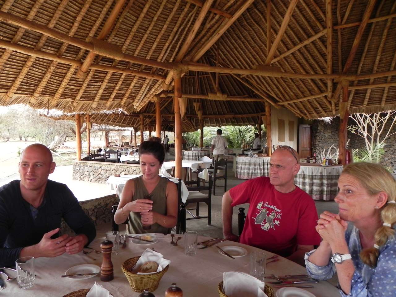 Nachdem wir unser Gepäck verstaut, und uns etwas frisch gemacht haben, geht meine Frau Hermine und ich mit Dagmar und Klaus um 13:45 gemeinsam zur Lounge bzw. Speisesaal. Hier treffen wir auch schon Alexandra u. Vito, sowie unser Brautpaar Raphaela und Chris. Was es zum Essen gegeben hat weiß ich nicht mehr, auf einem meiner Bilder ist ein Fleischgericht zu sehen, das in einem Reismantel mit Gemüse serviert wird. Auf weiteren Fotos die wir gemacht haben, ist nur zu sehen, dass Dagmar und die anderen einen Salatteller vor sich stehen haben. Und natürlich einige Flaschen mit Tusker Bier stehen auf dem Tisch. So verbringen wir einige Zeit in der wunder-schönen Lobby, bevor wir gegen 16:15 zurück zu den jeweiligen Unterkünften gehen.