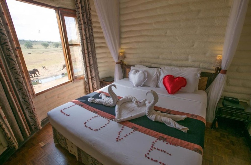 Bei der Cafeteria gibt es einen schönen Ausblick zu den hier trinkenden Elefanten, der Abstand wie schon gesagt etwa 8 Meter. Als wir später das Zimmer unseres zukünftigen Brautpaares anschauen, können wir sehen dass die Zimmerboys vom Hotel sich viel Mühe gegeben haben, um das Zimmer des künftigen Brautpaares schön zu schmücken.