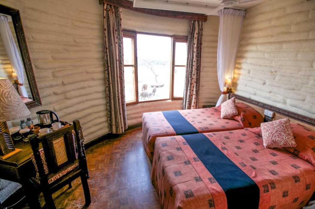 Unsere beiden Chauffeurs haben mittlererweile die Verdecke unserer Geländewagen so hoch geklappt, so dass für uns die Sicht nach außen unbeschränkt ist. Auf einem Schild gleich am Eingang können wir lesen, dass die Höchst-Geschwindigkeit hier im Park bei max. 30 K.P.H. ist. Unser nächstes Ziel, die Salt Lick Game Lodge dagegen 7,4 Kms entfernt ist. Als erstes sehen wir hier Kuhantilopen, Zebras und weiter vom Weg entfernt unter einem schattigen Baum eine Löwendame die sich hier faul räkelte. Nach etwa einer halben Stunde über die ziegelrote Erde haben wir unser heutiges Tagesziel erreicht, vor uns liegt die Salt Lick Game Lodge.