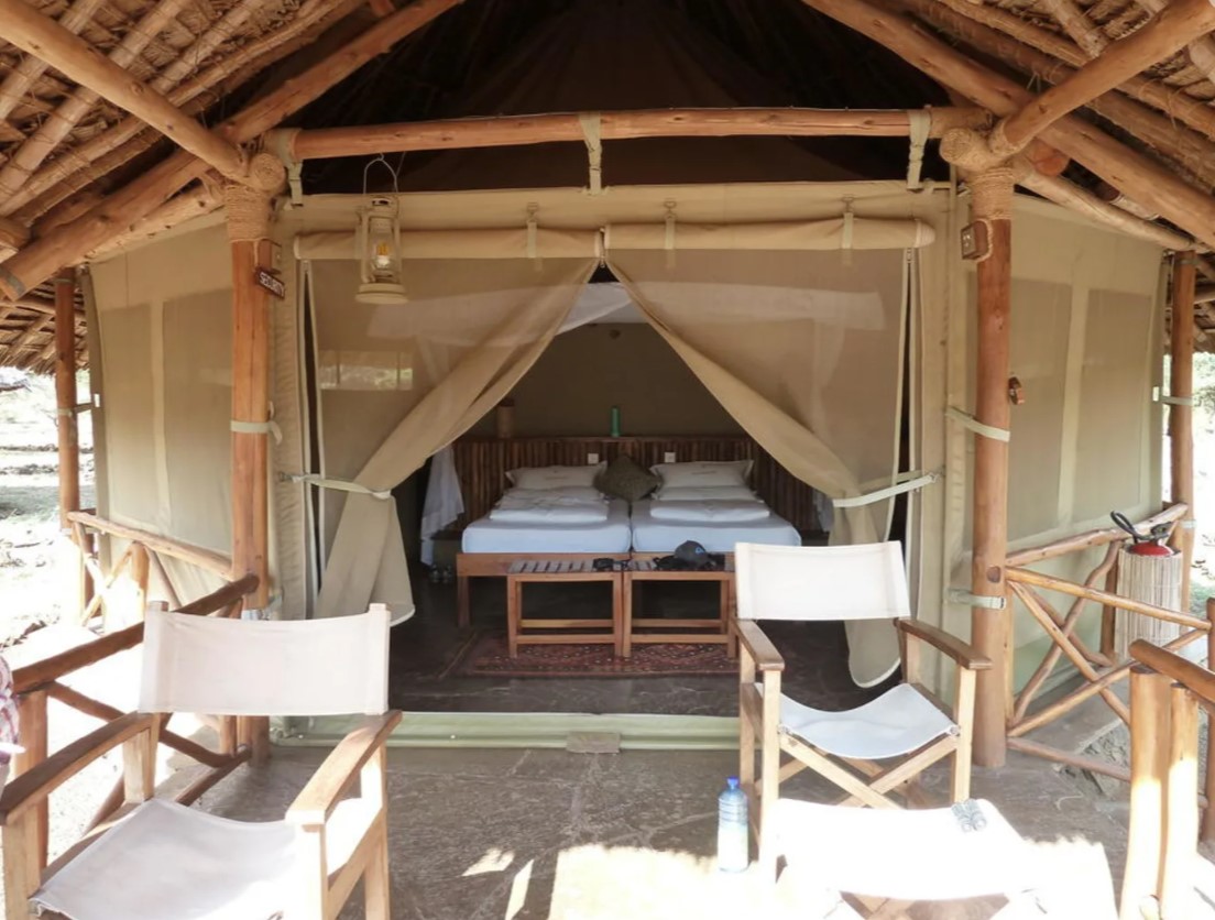 Unser Camp hat 21 Zelte die großzügig auf weiter Flur aufgestellt sind, und über Wege, die mit Steinen abgegrenzt sind, miteinander und dem Zentralgebäude verbunden sind. Alle Zelte sind achteckig und mit robustem Canvasstoff verkleidet, das äußere Dach ist mit zusätzlich Stroh bedeckt. Sie haben eine Größe von 34 qm und zusätzlich eine Terrasse mit 7,4 qm. Sie sind sehr komfortabel mit fließend Kalt- und Warmwasser, Dusche, seperater Toilette und einem Bidet eingerichtet. Ein großes Doppelbett mit Moskitonetz in der Mitte des Raumes, einen Safe, einen kleinen Schreibtisch mit zwei Stühlen, und selbstverständlich auch Strom. Vom Bett aus kann man die Tiere die sich vor dem Zelt aufhalten durch einen Netzvorhang betrachten, nicht weit entfernt ist eine Wasserstelle zu sehen. Für unser Brautpaar Raphaela und Chris ist eine Junior-Suite reserviert, das ist ein Steinhaus mit mehreren Räumen und einer Terrasse sowie einem privaten Innenhof mit einer Regen-Außendusche.