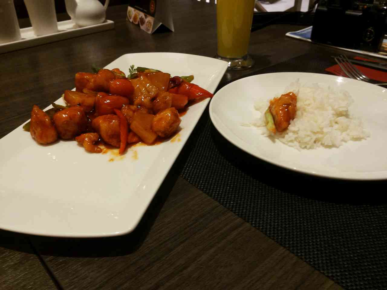 Irgendwann fahren wir mit dem Fahrstuhl wieder nach unten, der Regen hat wieder aufgehört. Jetzt gehen wir in unser Asia Restaurant das in der Dubai Mall einige Stockwerke über dem normalen Eingangs-Level liegt. Als Tischnachbarn haben wir ein junges Pärchen aus den USA, ich meine aus New York. Zum Essen bestellen wir etwas Pikantes mit Hühnchen und Reis, es schmeckt auf jeden Fall sehr gut.