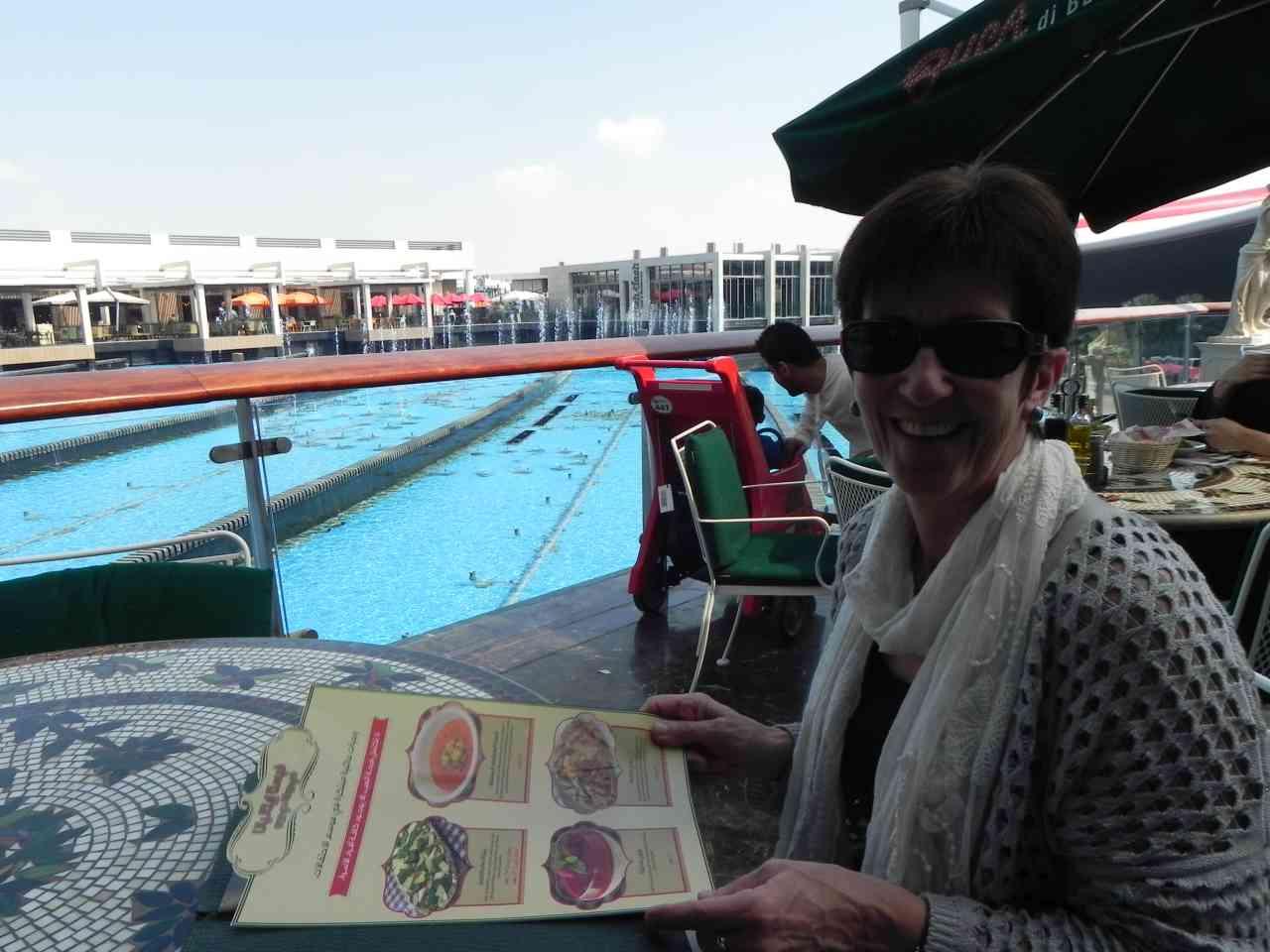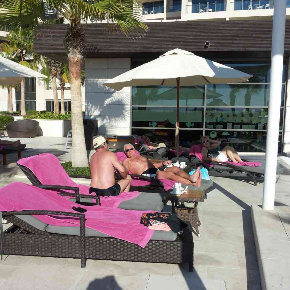 Gegen halb Vier sind wir dann wieder in Hotel Crown Plaza angekommen, nach einem kurzen Aufenthalt im Zimmer um unser Gepäck los zu werden, gehen wir noch zum Pool hinunter. Ein kühles Bier und mal kurz entspannen und die Sonne genießen. Vor uns auf einer Liege hat Hermine ein älteres Ehepaar mit einer Plastiktasche mit dem Emblem von mein Schiff entdeckt. Kurze Zeit drauf führte sie ein längeres Gespräch mit den beiden, sie waren wohl sehr aufgeschlossen. Als wir am Spätnachmittag den Pool verließen konnte ich auch noch ein paar Worte mit den beiden wechseln.