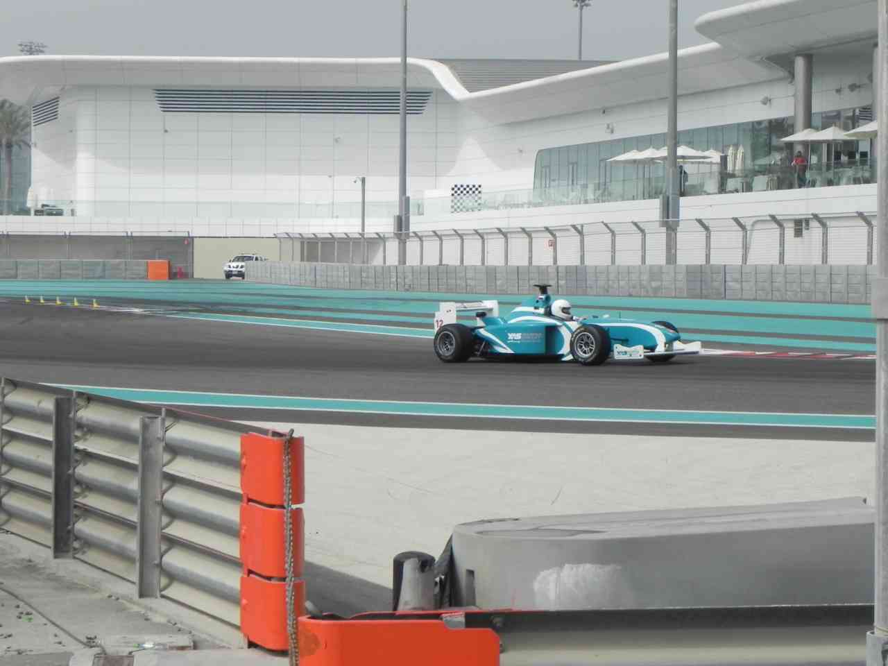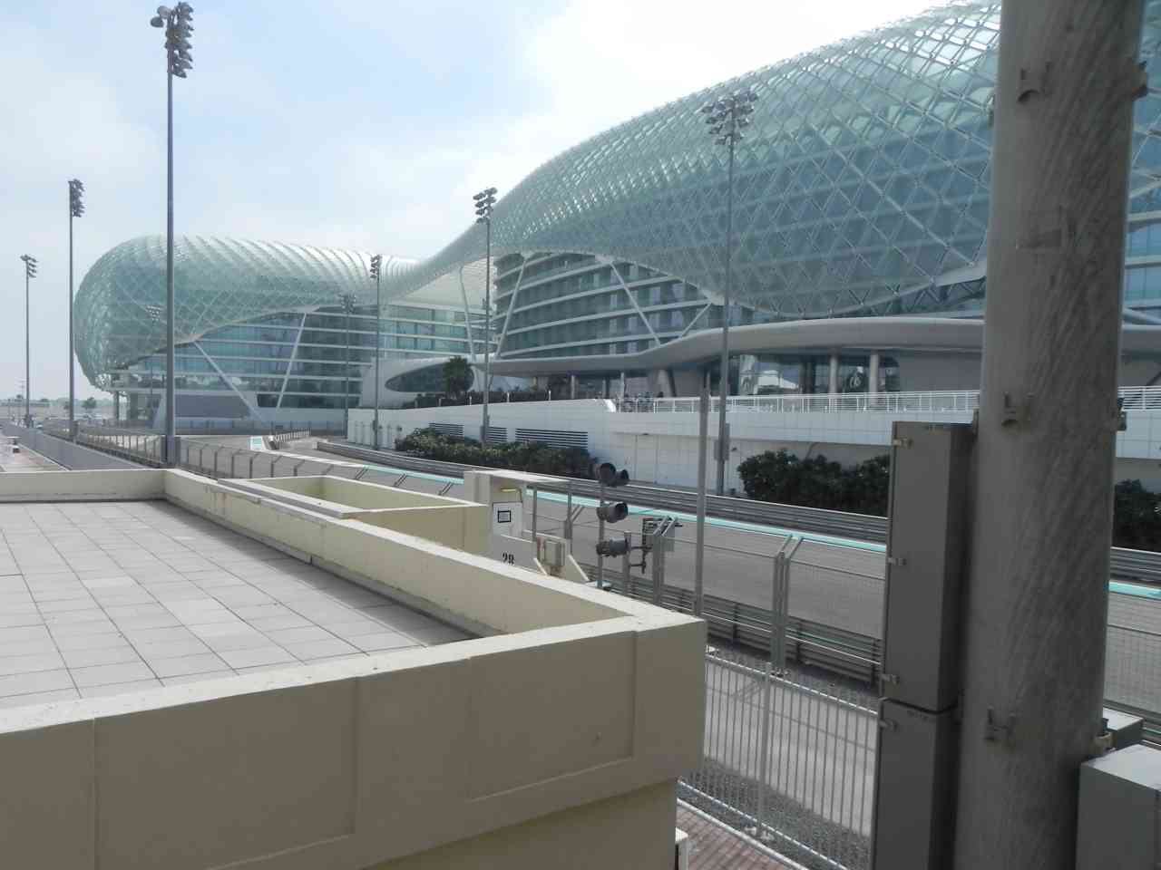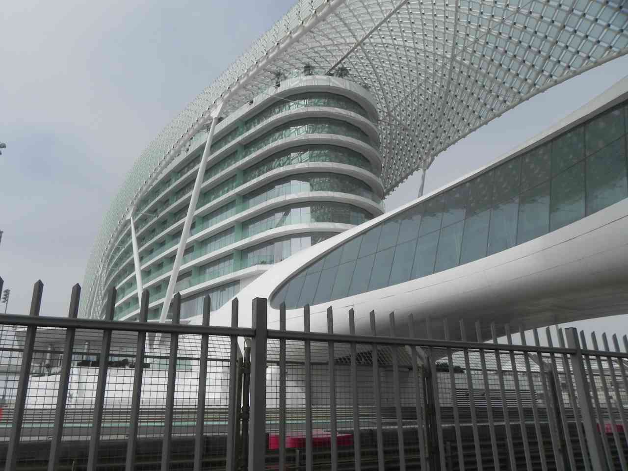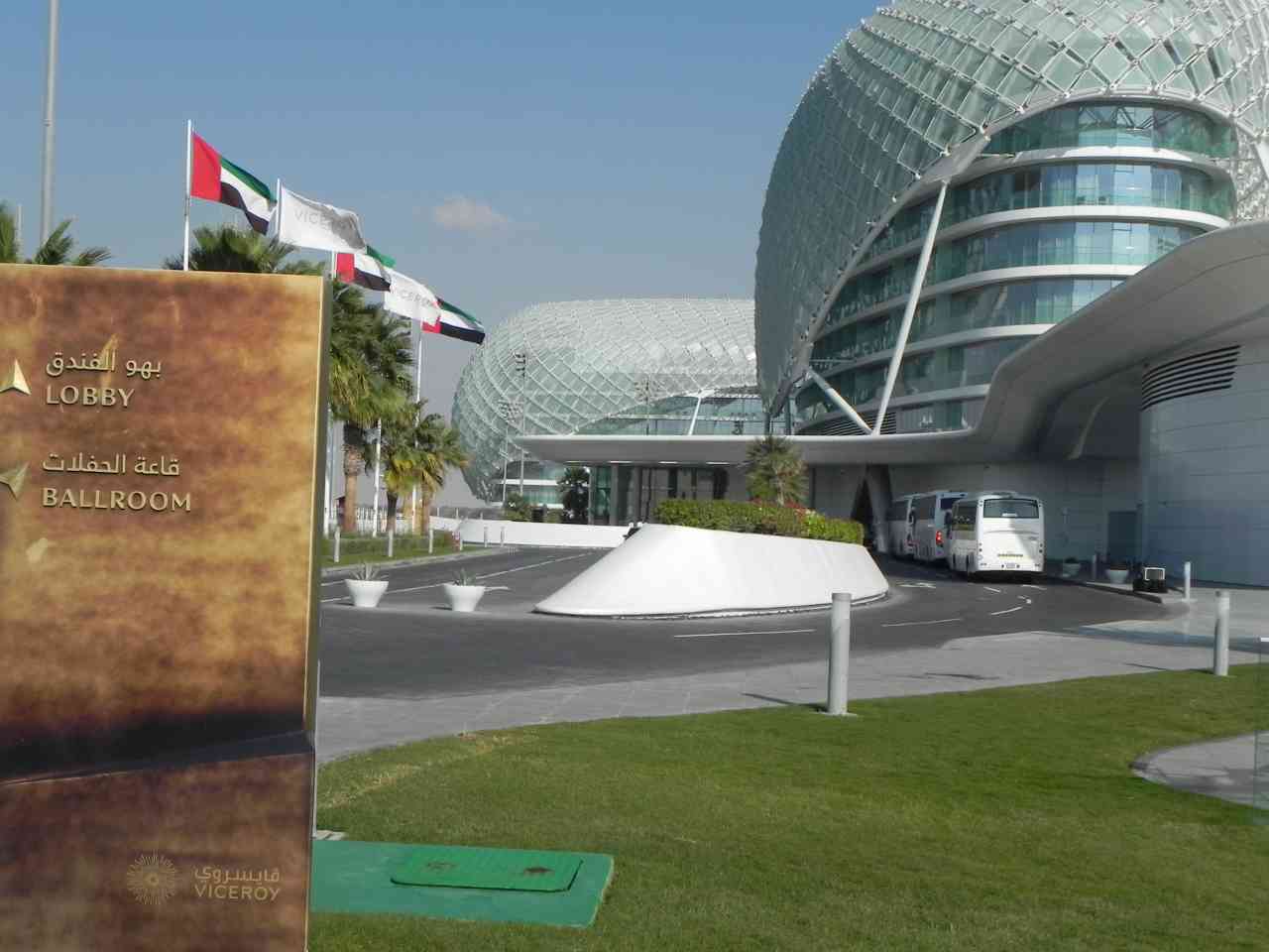 So verbrachten wir hier die nächsten 2 Stunden in der warmen Morgensonne. Gegen halb zwölf Mittags sind wir dann zur Rezeption zurück gegangen und bekamen ein Zimmer im sechsten Stock mit der Zimmernummer 612 zugewiesen. Nachdem wir uns kurz frisch gemacht haben, wollten wir uns unbedingt noch mal die Füße vertreten. Unser Hotelviertel liegt auf einer kleiner Anhöhe wir sind also die Straße hinunter gegangen , dann über eine große Kreuzung und rechts vor uns liegt schon der Yas Marina Circuit, das ist die Formel Eins Rennstrecke von Abu Dhabi. Wir gehen noch etwas weiter, da kommt auch schon der Eingangsterminal vom Hotel Yas Viceroy einem Fünf-Sterne-Haus direkt hier an der Rennstrecke. Der Portier und die hier installierten Kameras sehen uns nicht, als wir an ihnen vorbei über eine Brücke gehen. Unter dieser Brücke läuft die Rennstrecke durch, das nächste Formel Eins Rennen hier in Abu Dhabi findet aber erst im November statt. So gehen wir weiter bis zum Hotel, es ist Super-modern und hat eine sehr eigenwillige Form. Der Korpus wird in der Nacht in unterschiedlichen Farben beleuchtet.