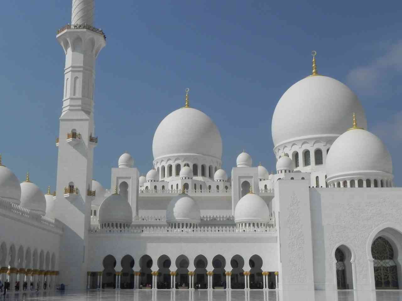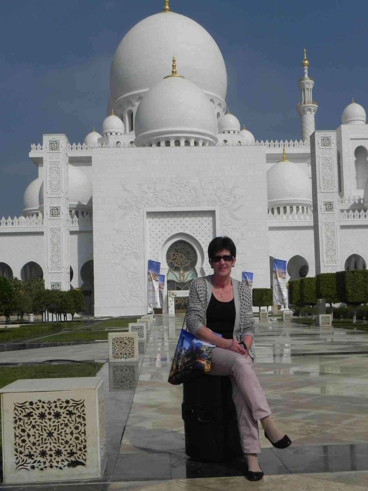 Heute Morgen wollen wir mit einem Taxi zur Grand Sheikh Zayed Moschee fahren, die hier irgendwo im Zentrum von Abu Dhabi liegen soll, wir müssen also früh raus aus den Federn. Um acht Uhr sind wir schon im Speisesaal. Unser Frühstücksbüffet ist reichhaltig und auch sehr schmackhaft. Gegen Zehn rufen wir ein Taxi vor unserm Hotel und fahren los, ca. 20 Minuten brauchen wir bis zur Moschee. Schon von weitem sehen wir sie „die Grand Sheikh Zayed Moschee “ diese Moschee ist riesengroß, sie ist die größte hier in den Emiraten und die drittgrößte der Welt, schneeweiß und auch wunderschön anzuschauen. Hier finden 40.000 Gläubige ihren Platz zum Gebet. Unser Taxi bringt uns vor den Eingang, 40 Dirham das sind ca.10 Euro will der Taxifahrer für die Fahrt, ich finde der Preis ist angemessen. Es sind aber schon viele Besucher hier, zuerst müssen wir aber in eine riesige Tiefgarage die unter dem Vorplatz der Moschee liegt, um uns umziehen. Hier sind große Räume wo die weiblichen Besucher aber auch männliche Besucher die nicht dem Islamischen Glauben entsprechend bekleidet sind, sich umziehen müssen.