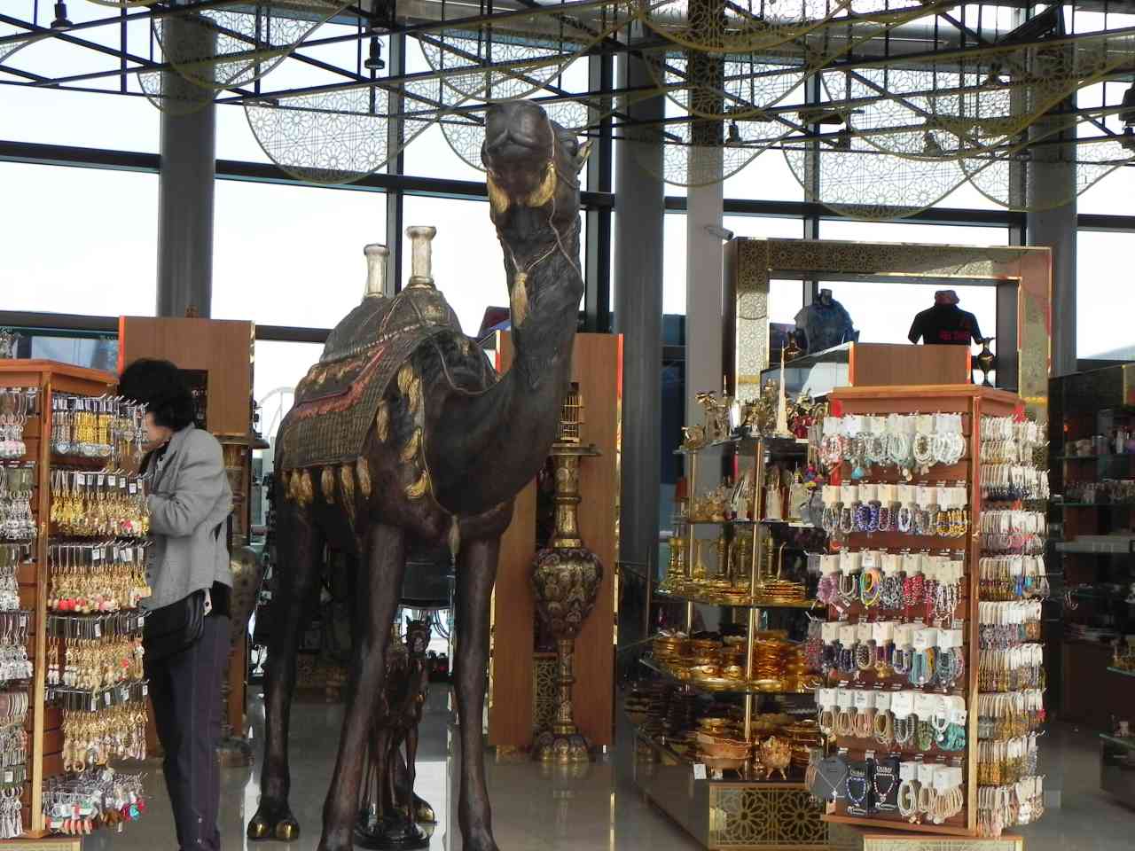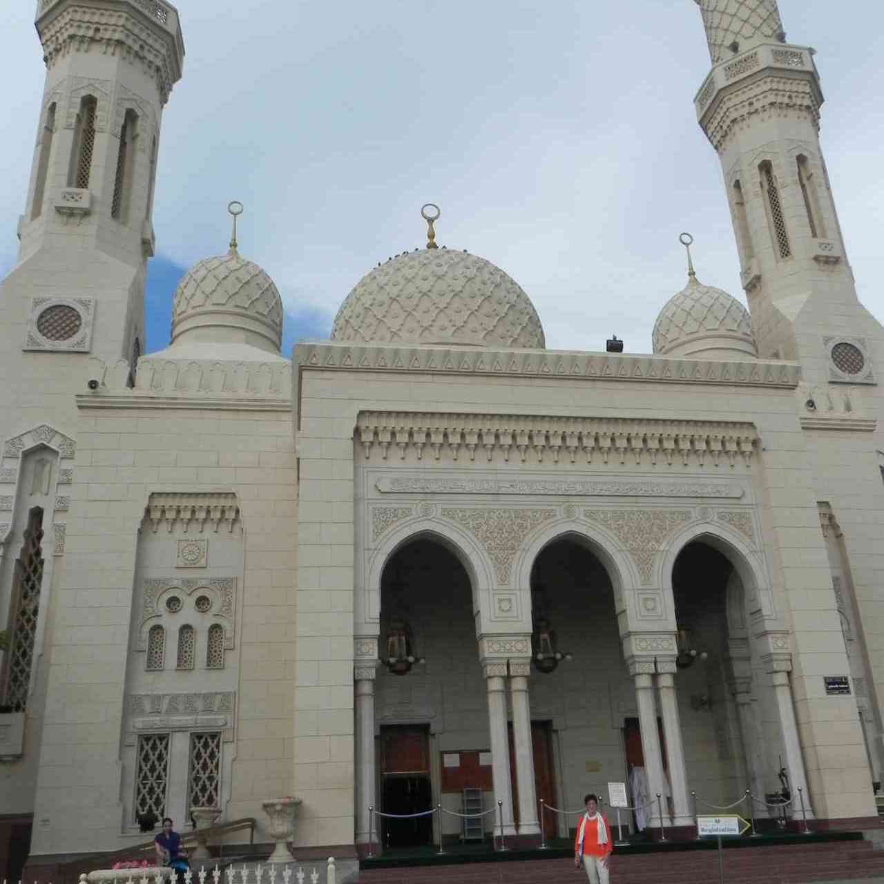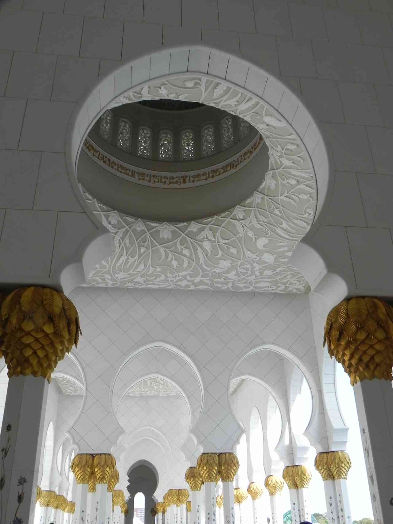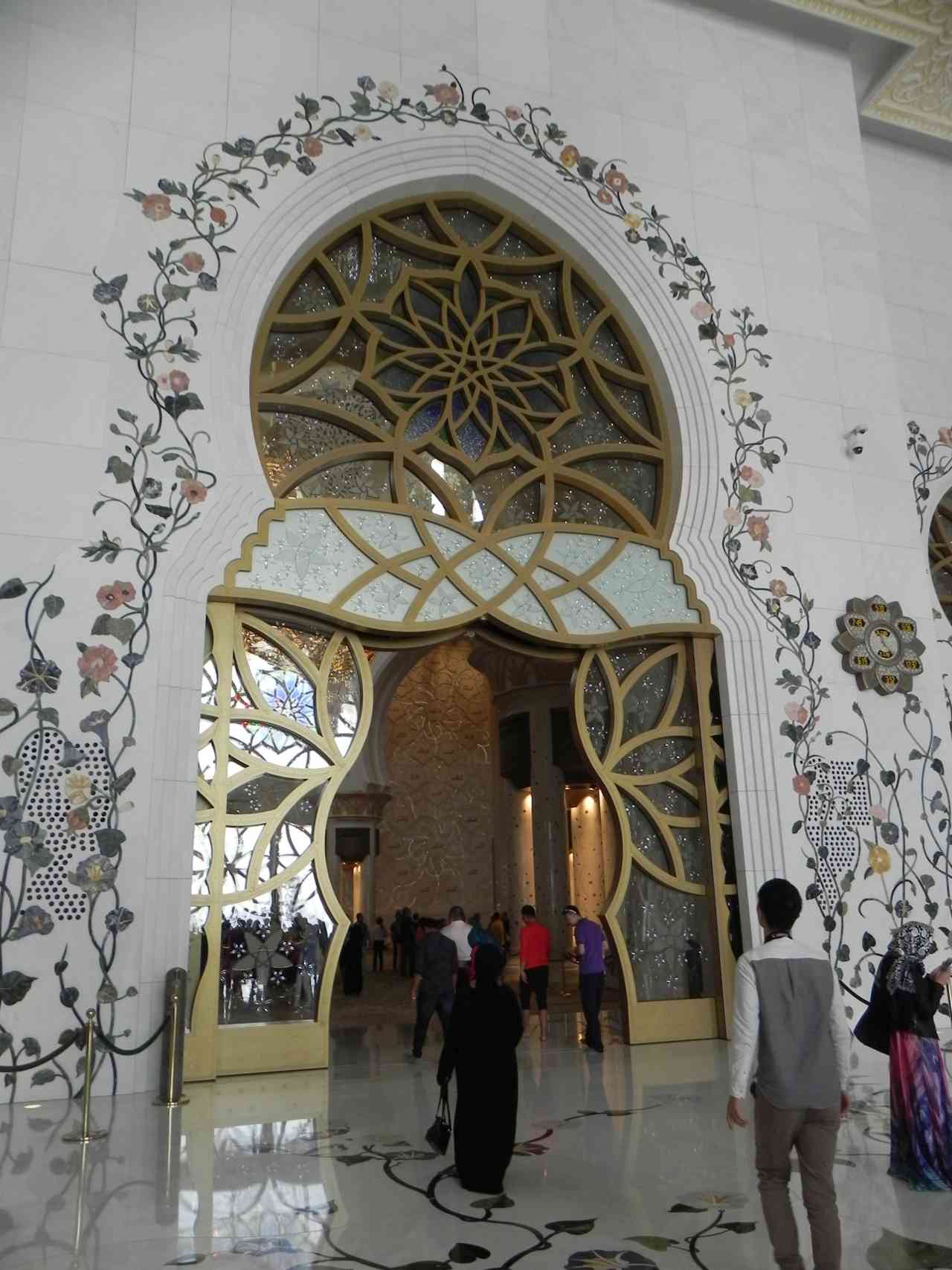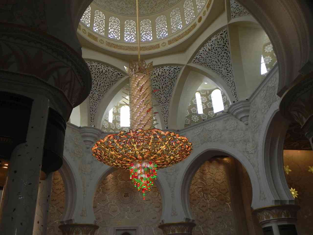 Meine Gattin muss sich einen schwarzen Umhang „ eine Abaya “ überziehen, dazu ein Kopftuch. Danach gehen wir rein, wie schon gesagt die Moschee ist wunderschön, eine schlichte Eleganz ganz in Weiß gehalten. Die Säulen mit Mosaiken und Girlanden aus Keramik und Gold geschmückt. Der Innenhof mit geschliffenen und farbigen Steinplatten ausgelegt. So gehen wir durch die Gänge bis zum Gebetsraum, hier müssen wir zuvor unser Schuhwerk ausziehen. Der Innenraum der Moschee ist riesengroß, und mit einem über 5600 Quadratmeter großen Teppichen ausgelegt. An der Decke befinden sich drei riesige Swarovski Kronleuchter. (Der größte davon wurde von einer Münchner Firma gebaut , er ist 15 Meter hoch und 10 Meter im Durchmesser. Er gilt als der größte Kronleuchter der Welt). Voll Staunen gehen wir durch die Räume und Hallen.