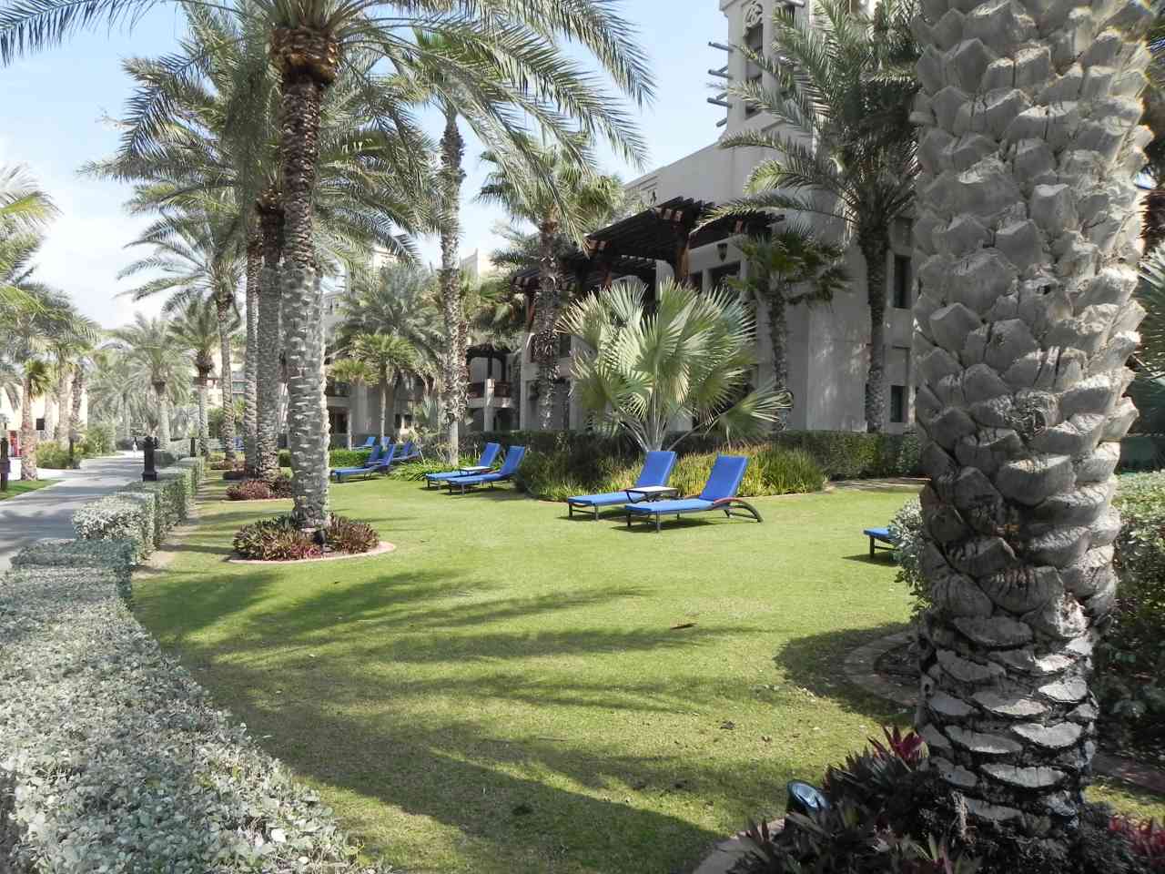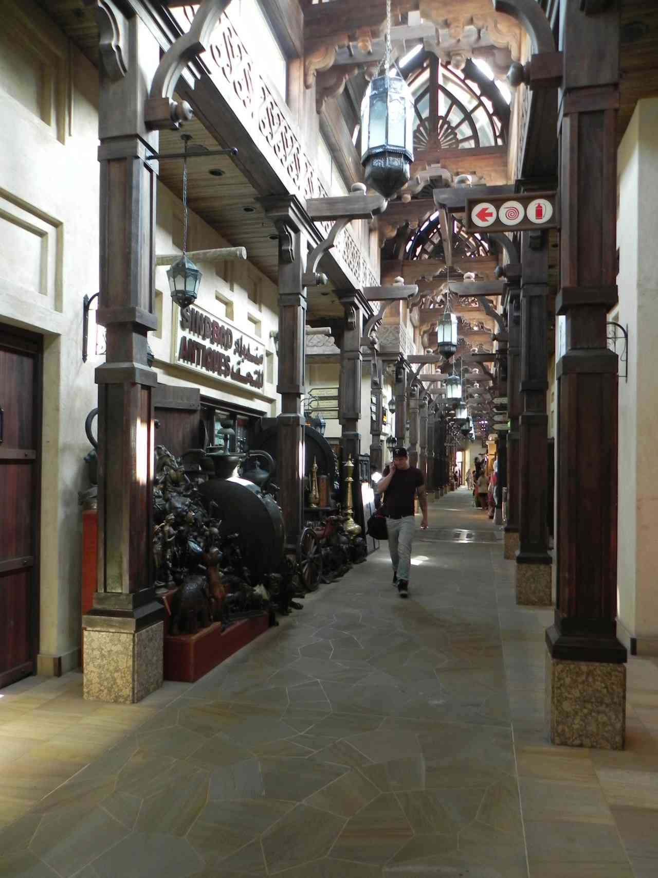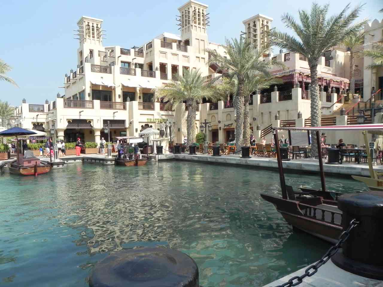 Unser nächstes Ziel ist das Madinat Jumeirah, das ist ein riesiger Hotelkomplex mit einem Souk und einem schön angelegtes Labyrinth aus Wasserstraßen auf denen sich Abras tummeln, so nennt man hier die kleinen Boote die mit den Gästen auf dem Kanal herum schippern. Auf eines dieser kleinen Boote wollen wir auch rauf, es heißt das nächste Boot fährt erst in einer halben Stunde. So spazieren wir an den Kanälen entlang. Als nächstes gehen wir noch ins Nobelhotel Al Wasr, das ist ein Nobelhotel im Traditionellen Arabischen Baustil, um auf seiner Cafe-Terrasse einen Cappuccino oder etwas ähnliches zu trinken. Nachdem uns ein Security-Mann schon abwimmeln wollte, führt uns ein junger Bediensteter doch noch in die Koubba-Bar die schöne Cafe-Terrasse im fünften Stock des Hotels.