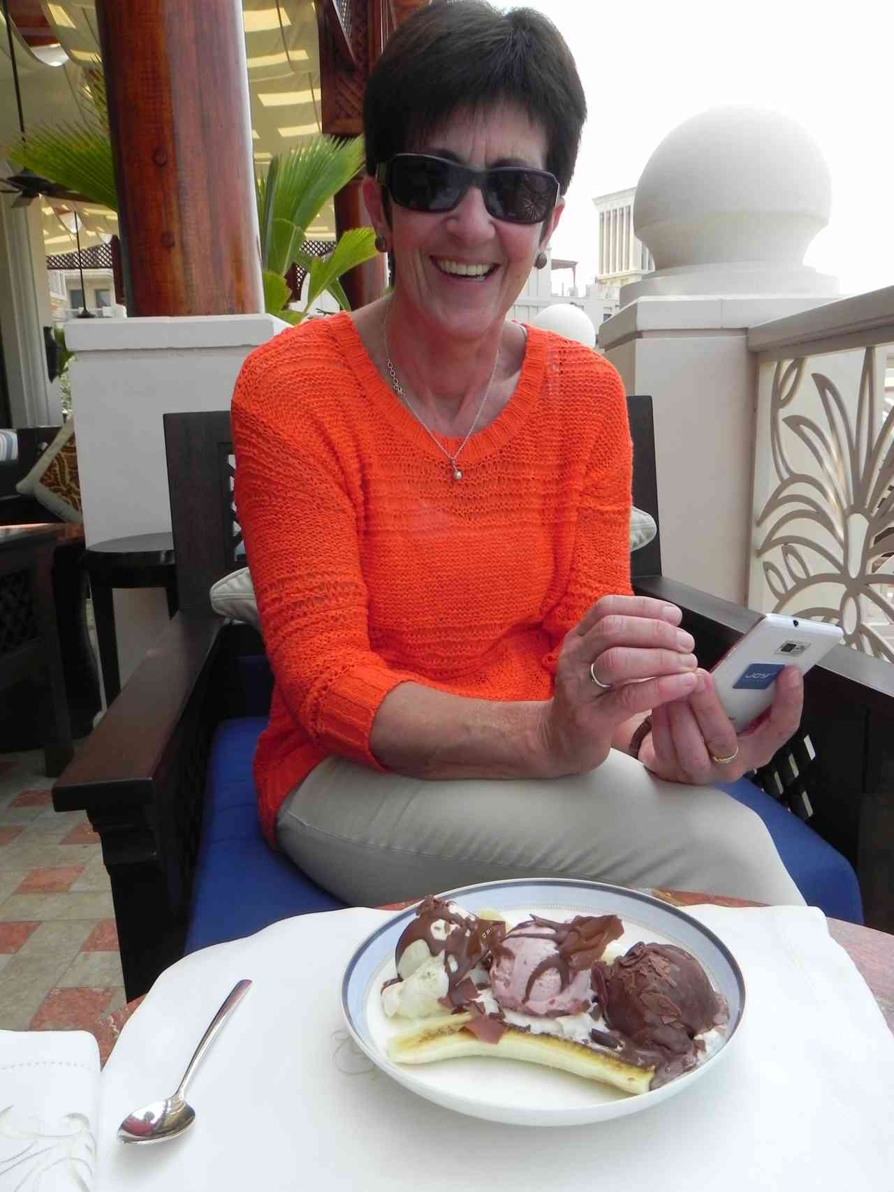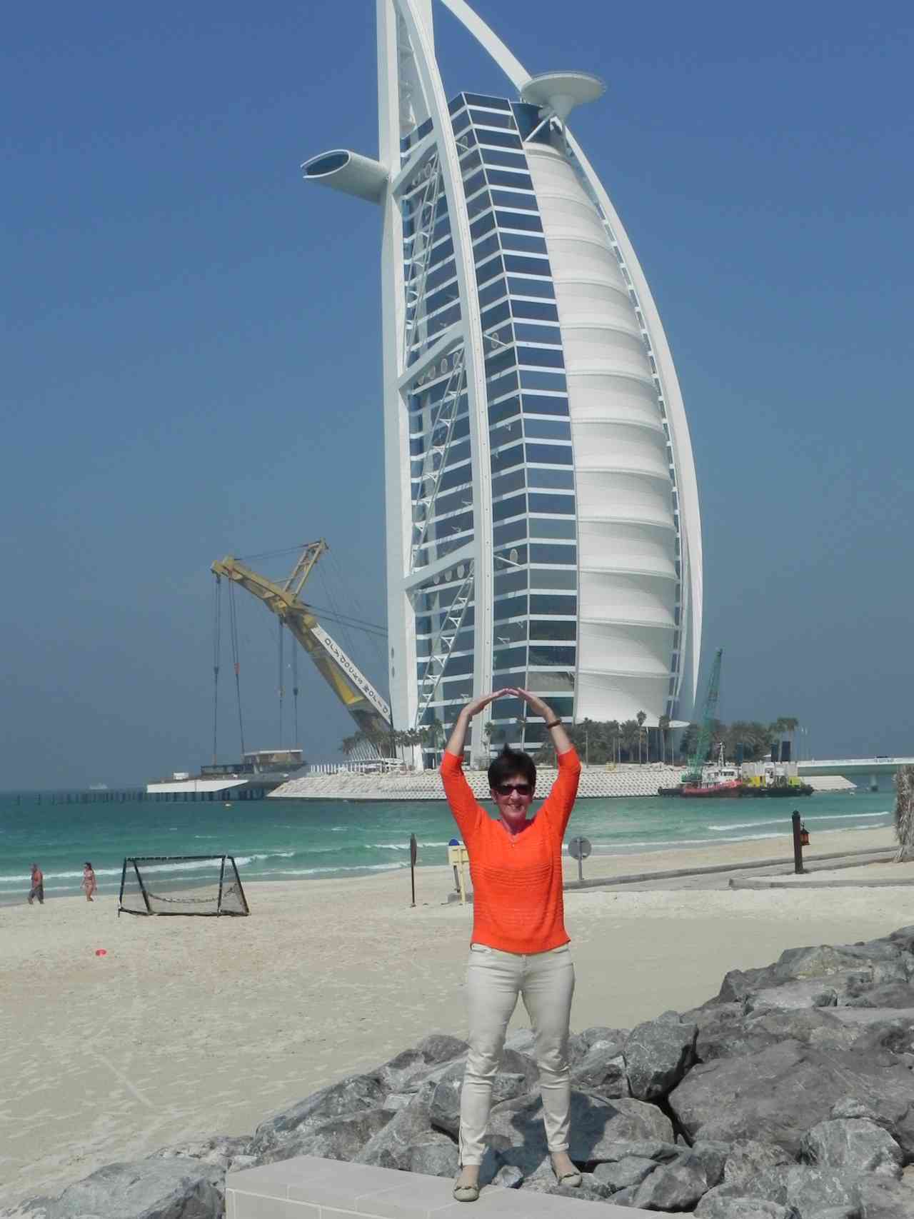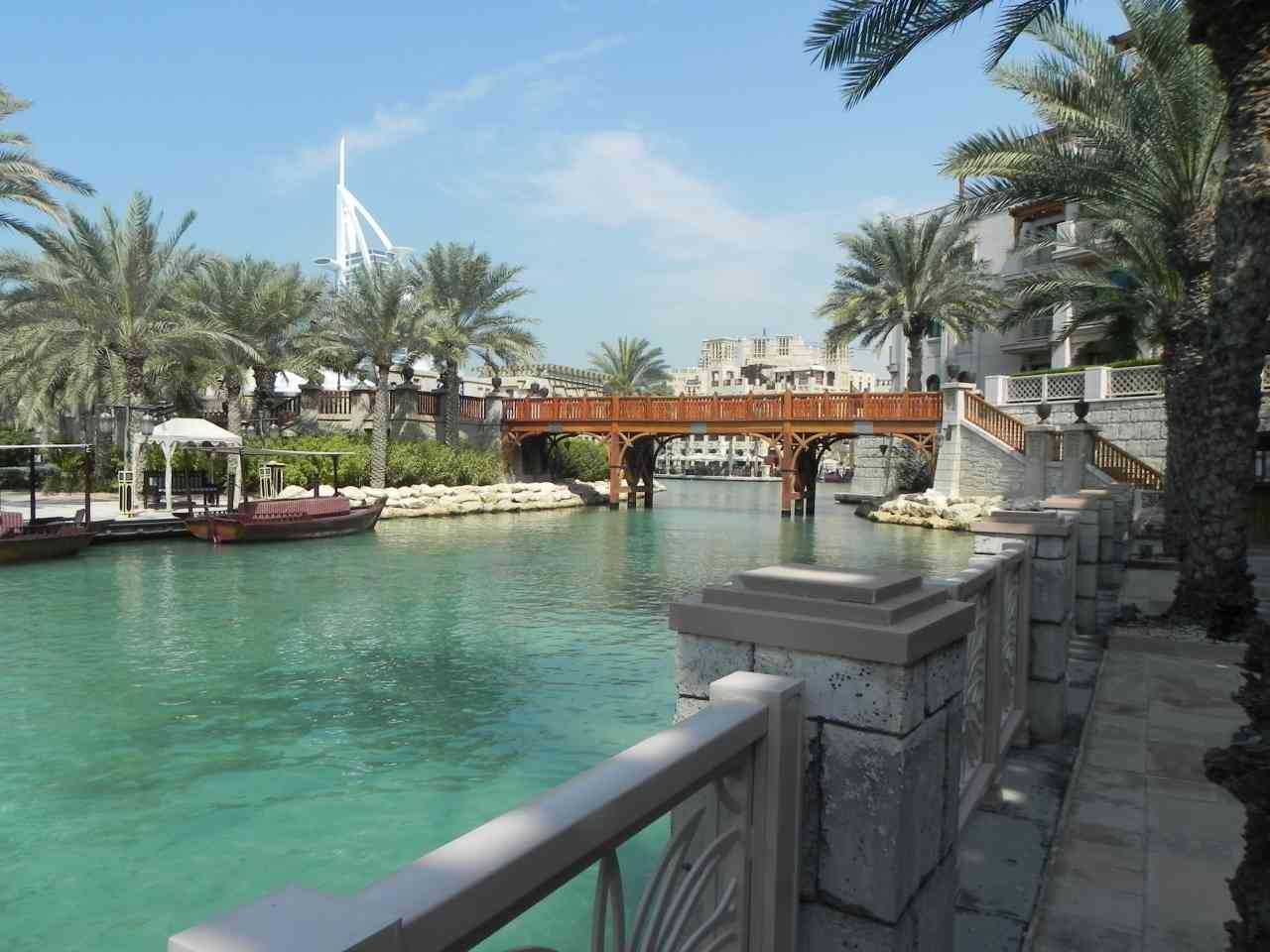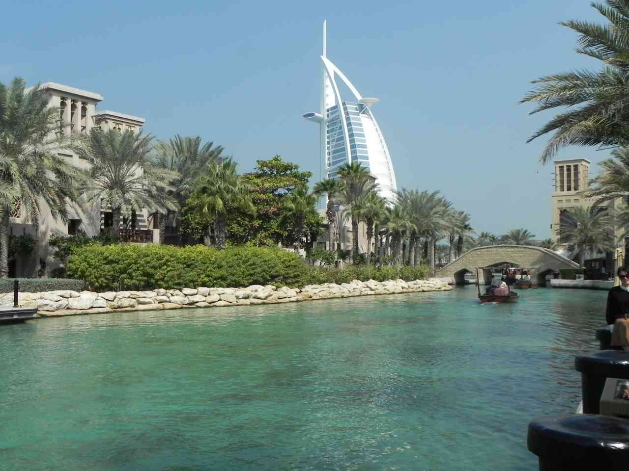 Von hier hat man eine wunderschöne Aussicht auf die Kanäle, und auch den Burj Al Arab kann man von hier aus sehen. Nach einem Blick in die Getränkekarte entscheide ich mich für eine Tasse Schokolade mit Sahne und einer Creme. Hermine bestellt sich einen Teller mit gemischtem Eis und einer Banane. Hier verbringen wir eine gute Stunde, bevor wir wieder weiter gehen. Mit einem Abra-Boot fahren wir aber dann nicht mehr, sie wollen für die etwa 20 Minuten ca. 18 Euro pro Person das ist es uns jetzt nicht mehr wert. Nachdem wir über eine Brücke auf die andere Kanalseite gewechselt haben, gehen wir Richtung Strand. Rechts auf der Landseite sind einige Luxushotels und jetzt vor uns links auf der Wasserseite sehen wir den Burj Al Arab in voller Schönheit, hier aus der Nähe erkennt man die wahre Größe (321,25 Meter) dieses luxurösen Hotelturmes in Form eines Dhau-Segels.