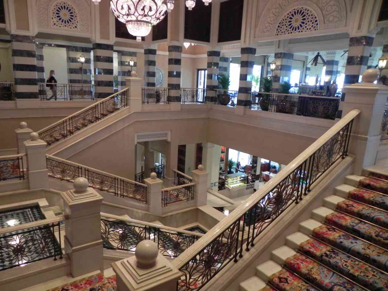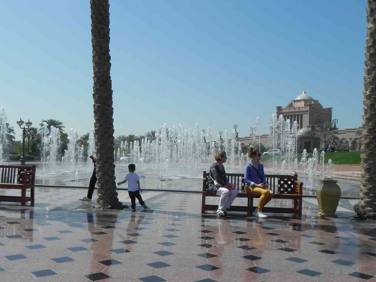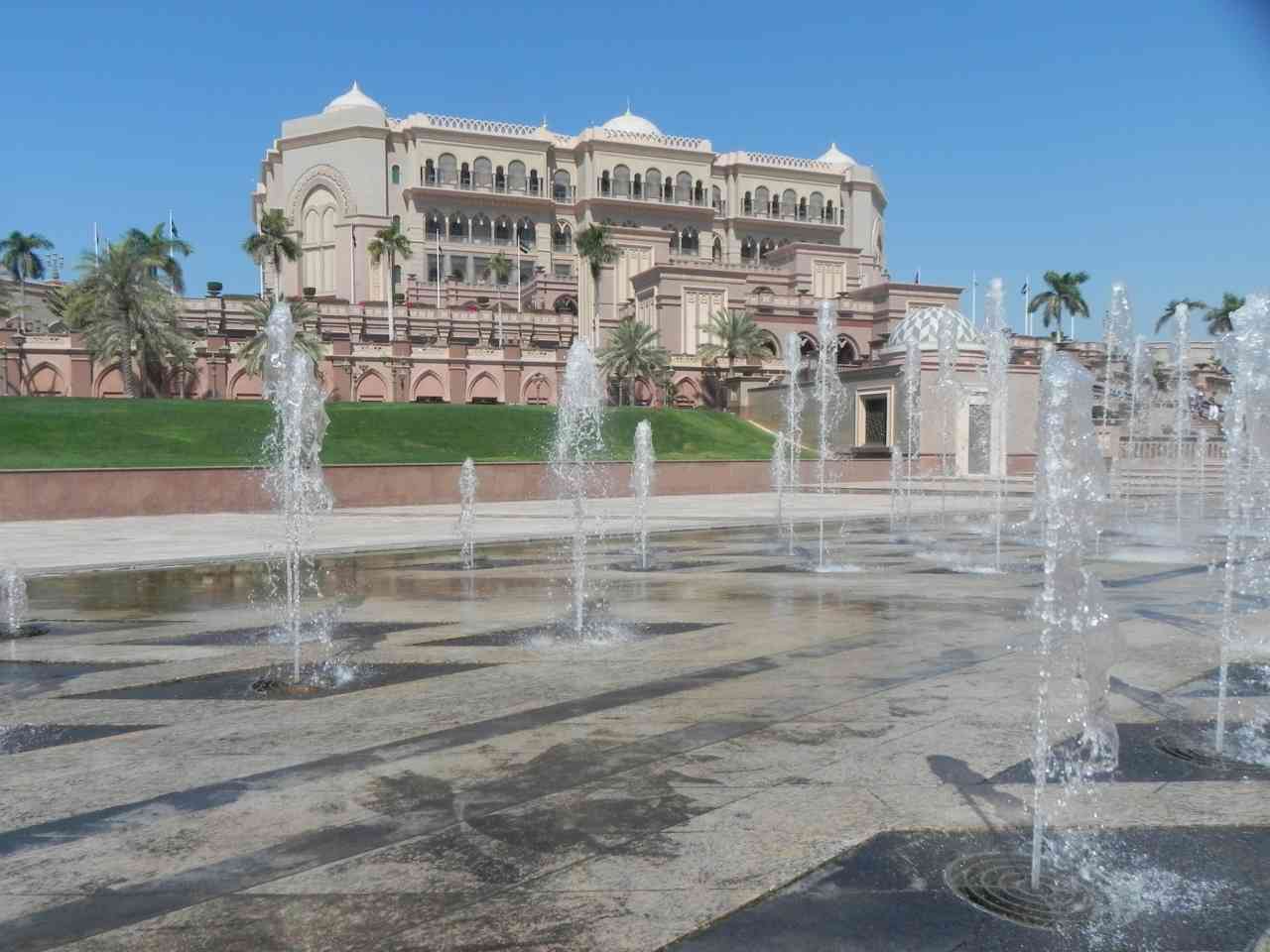 Wir schauen uns auf den unteren Stockwerken alles genau an. Weiter hinten im Untergeschoß ist ein Cafe, hier wird Tee oder Kaffee gereicht für Haus-Besichtigungen die über die Reisebüros vor Ort gebucht werden können. Natürlich ein stolzer Preis, für den Ausflug mit Tee oder Kaffee hier in den Emirates Palace und im Viceroy Hotel muss man fast 100 Euro ausgeben. Da haben wir es billiger bekommen. Den Strand vom Hotel besuchen wir nicht mehr, um dieses Luxus-Hotel komplett anzuschauen bräuchten wir allein ein paar Stunden. Danach gehen wir wieder nach draußen um uns den Park vor dem Hotel anzuschauen. Wunderschöne Balustraden und Wasserspiele kann man hier sehen, wir gehen noch durch weitere Torbögen um auch den Ostflügel dieses gewaltigen Komplexes zu sehen. Von der Frontseite vorne kann man nur Teile dieses riesiges Hotel sehen. Es heißt die gesamte Länge des Hotel wäre bei rund einem Kilometer.
