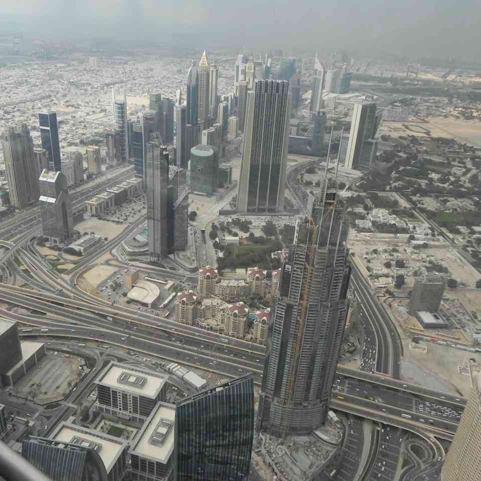 Um in die südwestliche Richtung zu schauen müssen wir von der Außenterrasse zurück in den voll verglasten Teil dieses Stockwerks, von hier sieht man über den großen Platz, wo die Wasseranlagen mit den Wasser-Fontainen vor dem Burj….. zu sehen sind. Am Himmel sind plötzlich starke Wolken zu erkennen, auf einmal wird es stark diesig und wir erkennen voller Staunen. Es regnet und das in Dubai wer hat das schon mal erlebt ?.