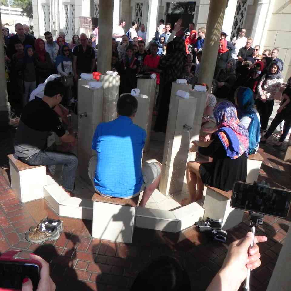 Nach einem doch sehr guten Frühstück besuchen wir die Jumeirah Moschee. Sie ist die Hauptmoschee und, die schönste und war auch die einzige Moschee in den Emiraten die von Besuchern die nicht dem Muslemischen Glauben angehören, besucht werden konnte. Sie ist ganz in der Nähe von unserem Hotel, aber leider ist sie im Moment noch geschlossen. Nachdem der Eingang zum Museum das gleich neben der Moschee liegt, geöffnet wird stellen wir fest dass es eine Führung durch beide Gebäude, also Museum und Moschee geben soll. Eine Mitarbeiterin zeigt uns als als erstes die Traditionelle Hände und Füße-Waschung vor dem Betreten der Moschee.