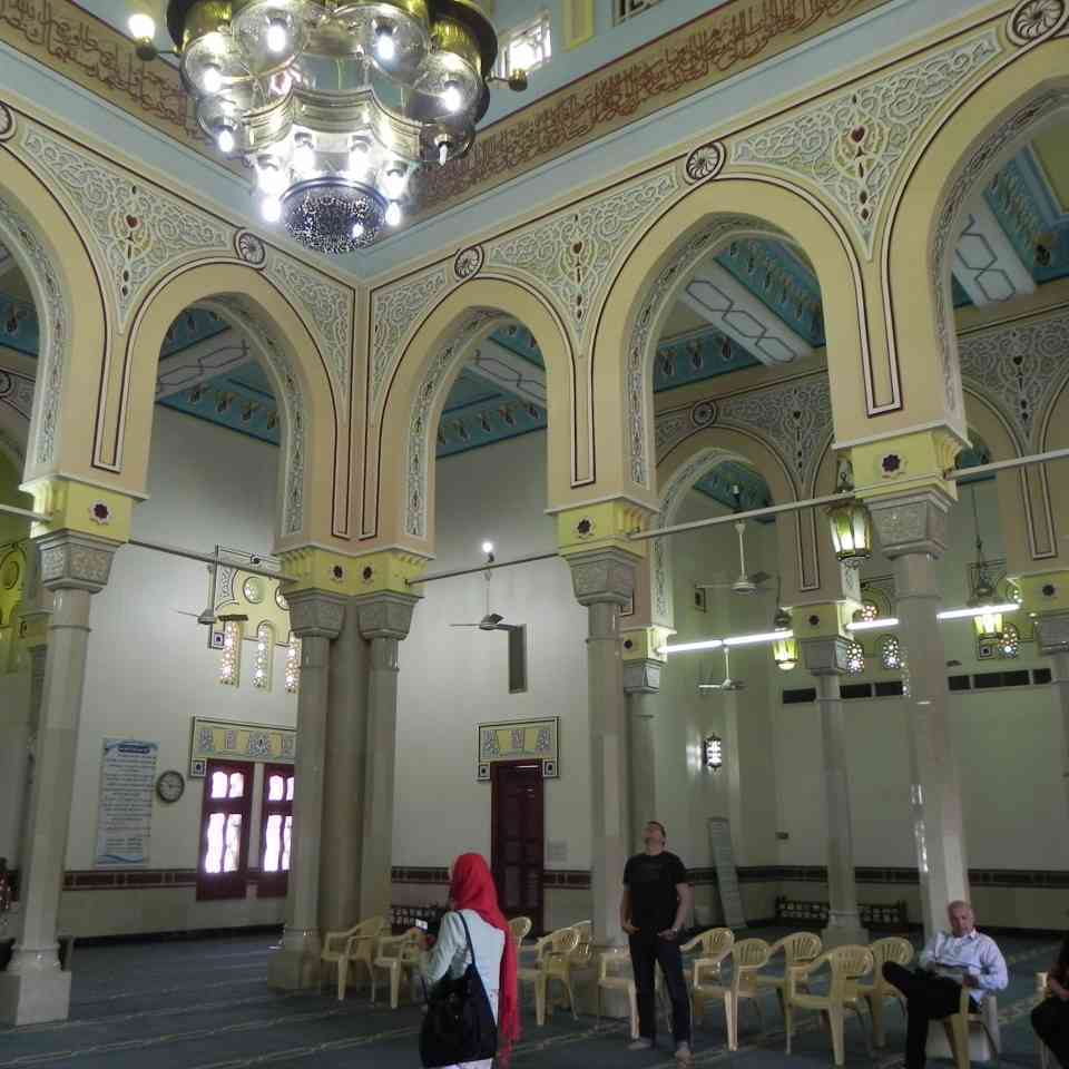 Sobald der Eingang zur Moschee geöffnet wird, gehen wir hinein und schauen uns hier im Innenraum um und können ein paar schöne Bilder darin machen. Aber bevor der Haupteingang wieder geschlossen wird, verlassen wir den Innenraum der Moschee. Unsere Zeit ist leider begrenzt da wir noch heute Vormittag in unserem Hotel Al Khoory Executive Hotel ausschecken müssen. So gehen wir zügig zurück ins Hotel, packen unsere Klamotten zusammen und verlassen das Haus wieder.