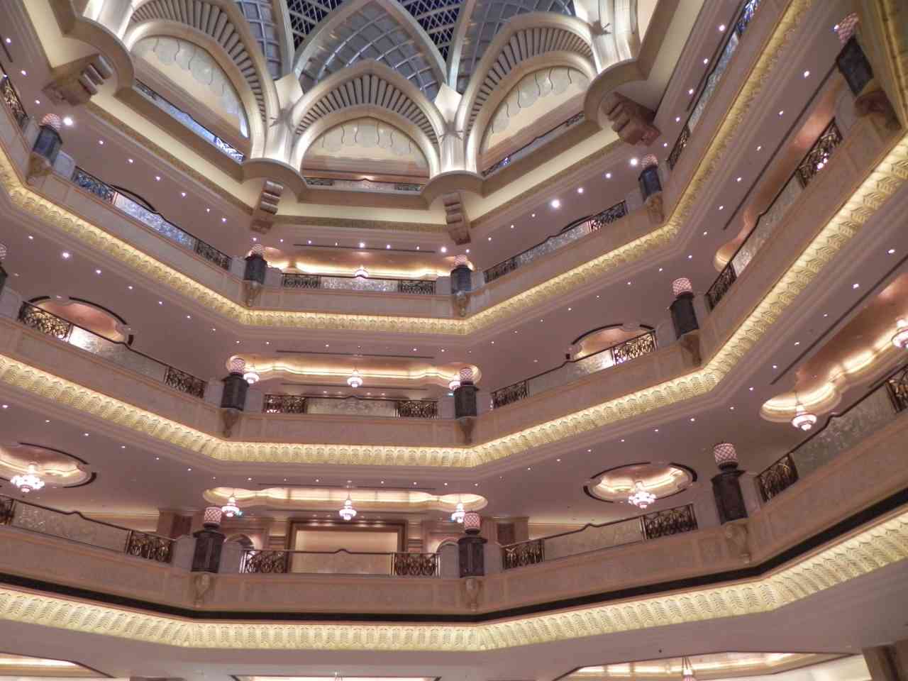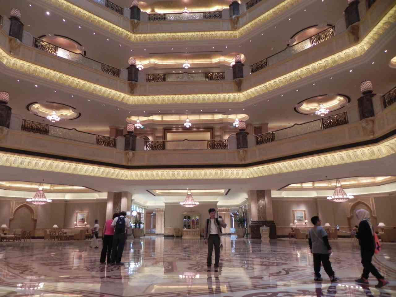 Nach einem kurzen Zimmer-Aufenthalt fuhren wir mit einem Taxi zum Emirates Palace in Abu Dhabi. Wir stiegen direkt vor der Eingangs-Lobby aus, und galten somit als Gäste des Emirates Palace Hotels. Das uns die Türen geöffnet werden braucht nicht besonders erwähnt werden. Wir schauen uns die Eingangshalle sowie die daneben liegenden Räume an. Hier herrscht Luxus pur, in den höheren Etagen werden Staatsgäste empfangen. Und noch ein Stockwerk höher sind die Fürstenzimmer für die Emirate, auch der König von Saudi Arabien hat hier eine eigene Suite mit über 800 qm.