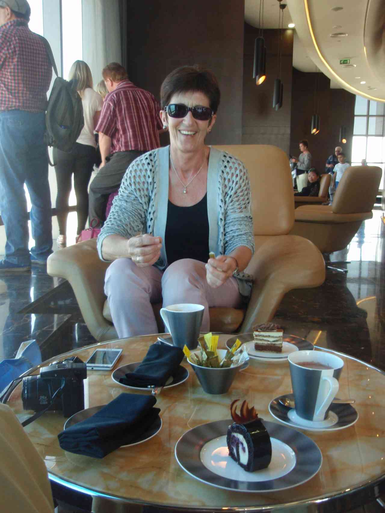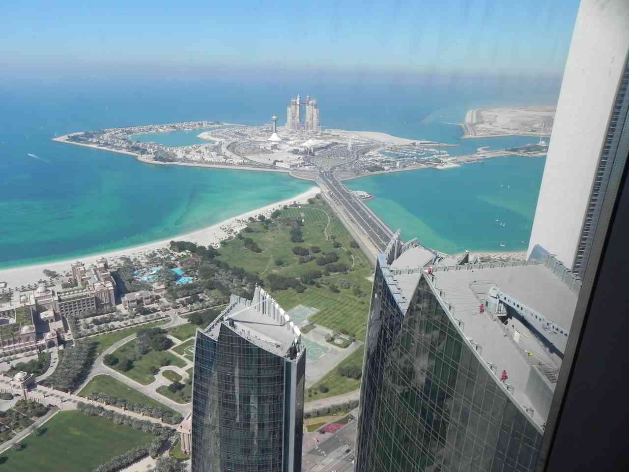 Hier ist Film und Fotografierverbot, was die wohl zu verbergen haben ?. Wir halten uns daran, obwohl wir fast hundert Meter vom Eingang entfernt sind. Unser nächstes Ziel ist der Etihad Tower, unser Cafe das wir jetzt besuchen werden befindet sich in Turm 5 im 74. Stock auf 300 Meter Höhe. Nachdem wir den Tower betreten haben, über eine Auffahrt kommen wir in eine Art Tiefgarage mit Taxistand. Von hier geht es zur Rezeption bzw. zu den Fahrstühlen zum Observationsdeck. Der gesamte Komplex ähnelt einer aufgebrochenen Orange mit fünf Türmen. Für den Eintritt muss man pro Person ca. 17 Euro bezahlen, allerdings werden 12,50 Euro im Cafe oben für den Verzehr angerechnet. Nach 15 Minuten bekommen wir einen schönen Platz am Fenster zugewiesen, mit einem wunderschönen Blick auf das Emirates Palace Hotel, das Meer dahinter, sowie den Palast des Scheiks von Abu Dhabi. Wir bestellen Cappuccino und dazu Kuchen aus einer Kuchenauslage, der ganz ausgezeichnet schmeckt. An einem Nachbartisch sehen wir auch Junge Emiratische Frauen ohne ihren Oligatorischen Schleier vor dem Gesicht.