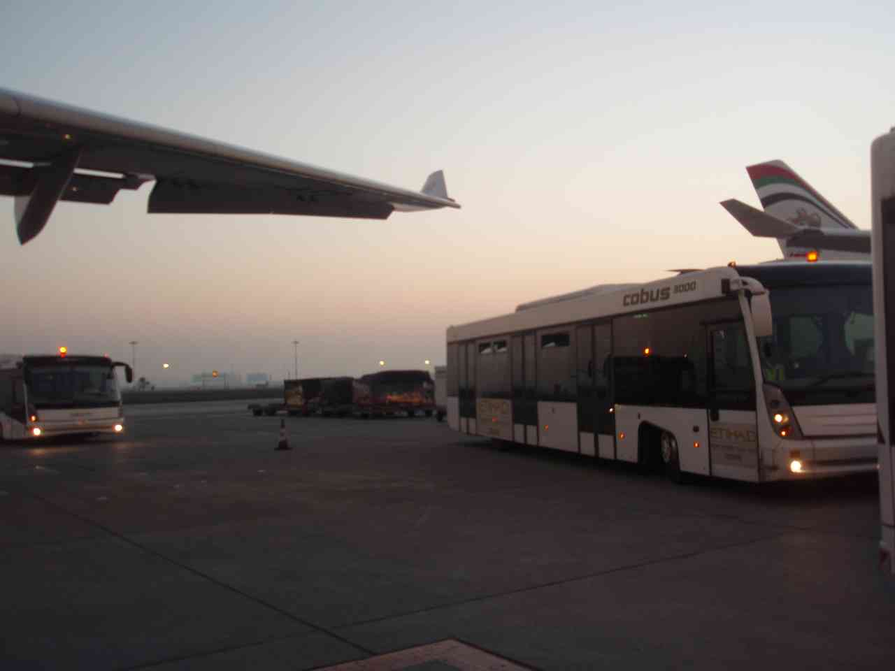 Um etwa 6:30 Morgens haben wir nach einem ruhigen Flug Abu Dhabi erreicht, zwischendurch gab es noch was zu knabbern. Nach unserer Landung und einer schnellen Abbremsung des Flugzeugs fährt der Pilot noch sehr lange über das Rollfeld, bis wir endlich vor dem Terminal 1 anhalten. Danach müssen wir einige Zeit warten, bis wir dann endlich unsere Maschine verlassen können. Mit einem Flughafenbus geht es zum Terminal, aber hier dann geht dann erst mal gar nichts mehr. Anscheinend sind hier mehrere Maschinen gleichzeitig gelandet, in endlosen Schlangen werden die Fluggäste von einer Kontrolle zur anderen gebracht. Was hier auffällt die meisten Fluggäste kommen aus Asien (Indien,Pakistan oder Nepal). Auch die Wege im Terminal sind nicht gekennzeichnet ( außer Arabisch ), so daß man keine Ahnung hat wo es hingeht, und wo es zur Passkontrolle oder zum Koffer abholen geht. Wir sind bestimmt eineinhalb Stunden im Terminal unterwegs, bis wir dann endlich fertig sind. Mein Pass wurde in der gleichen Paßkontrolle von drei verschiedenen Personen geprüft bis ich endlich passieren konnte. Keine Ahnung warum, meine anscheinende Ähnlichkeit mit Türken oder Arabern kommt wohl immer wieder mal zum tragen.