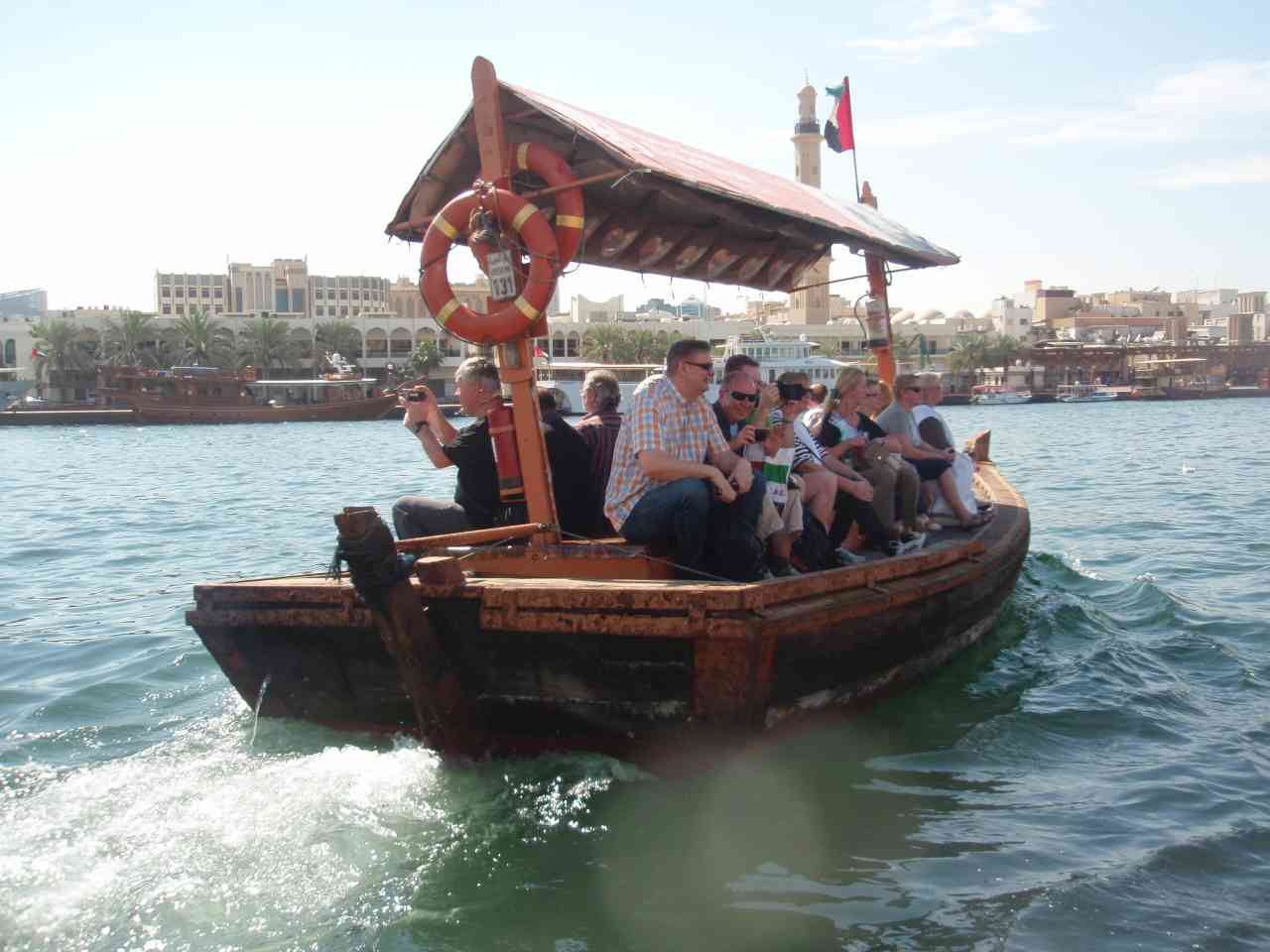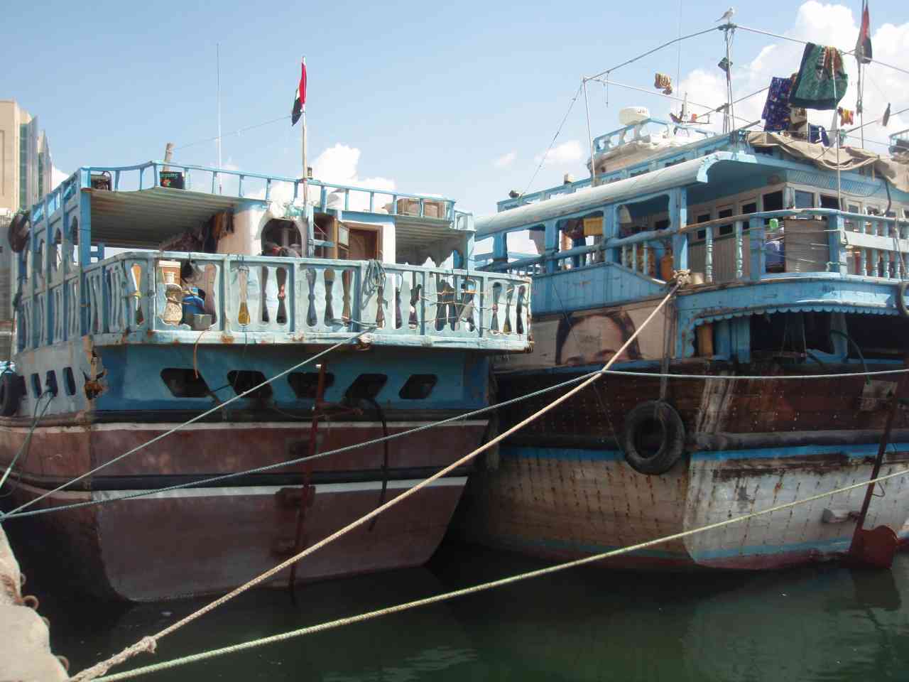 Unser nächstes Taxi fährt uns zum Creek, das ist eine Art Flusslauf der etwa 14 km ins Land hinein reicht. Wir fahren dann mit einer Abra (Boot) über den Fluß in den Ortsteil Deira. Hier gibt es einige Souks (Markt) die noch zum Besuch einladen, den Deira-Souk für Gewürze und Andenken oder Ähnliches, einen Souk für Textilien und den Gold-Souk für die größeren Geldanlagen. Hier gibt es auch den Größten Ring der Welt ca. 8 kg schwer reines Gold, der passende Finger dazu müsste allerdings noch gefunden werden. (Näheres in meinem Reisebericht VAE 2020). Nachdem wir in diesem Viertel einige Runden gedreht haben, und auch die Dhau`s angeschaut haben die hier vor Anker liegen. Es werden gerade Frachtballen ausgeladen, wir fragen nach wo die Fracht herkommt, es sind Textilien aus Asien. Die mit dem LKW weiter oder mit einem Sackkarren gleich hinüber zum Deira-Souk gebracht werden.