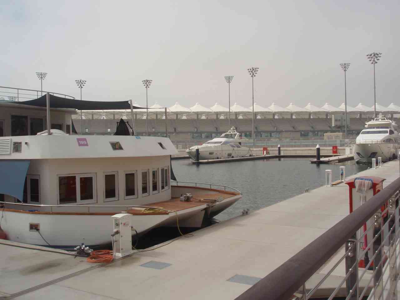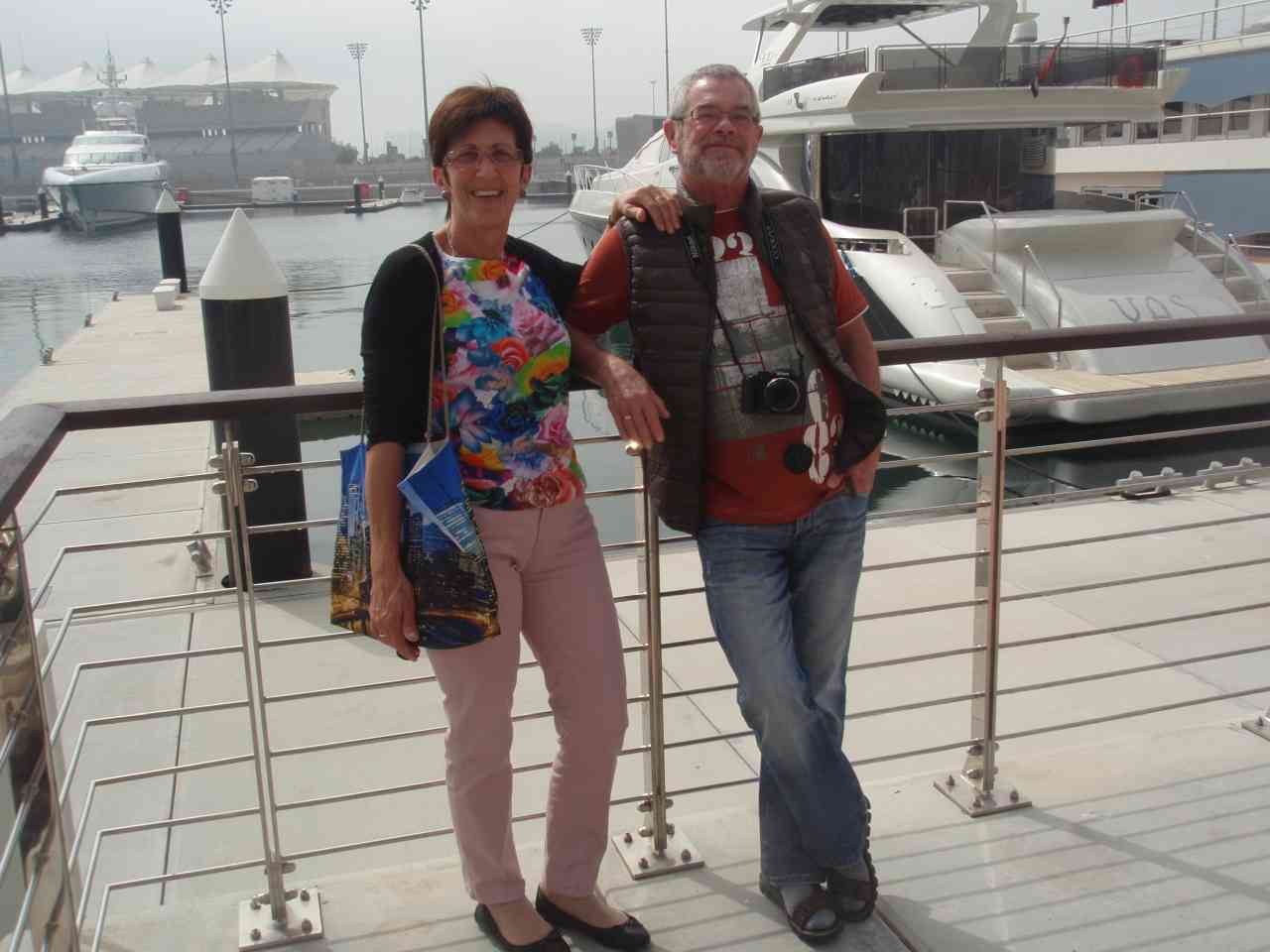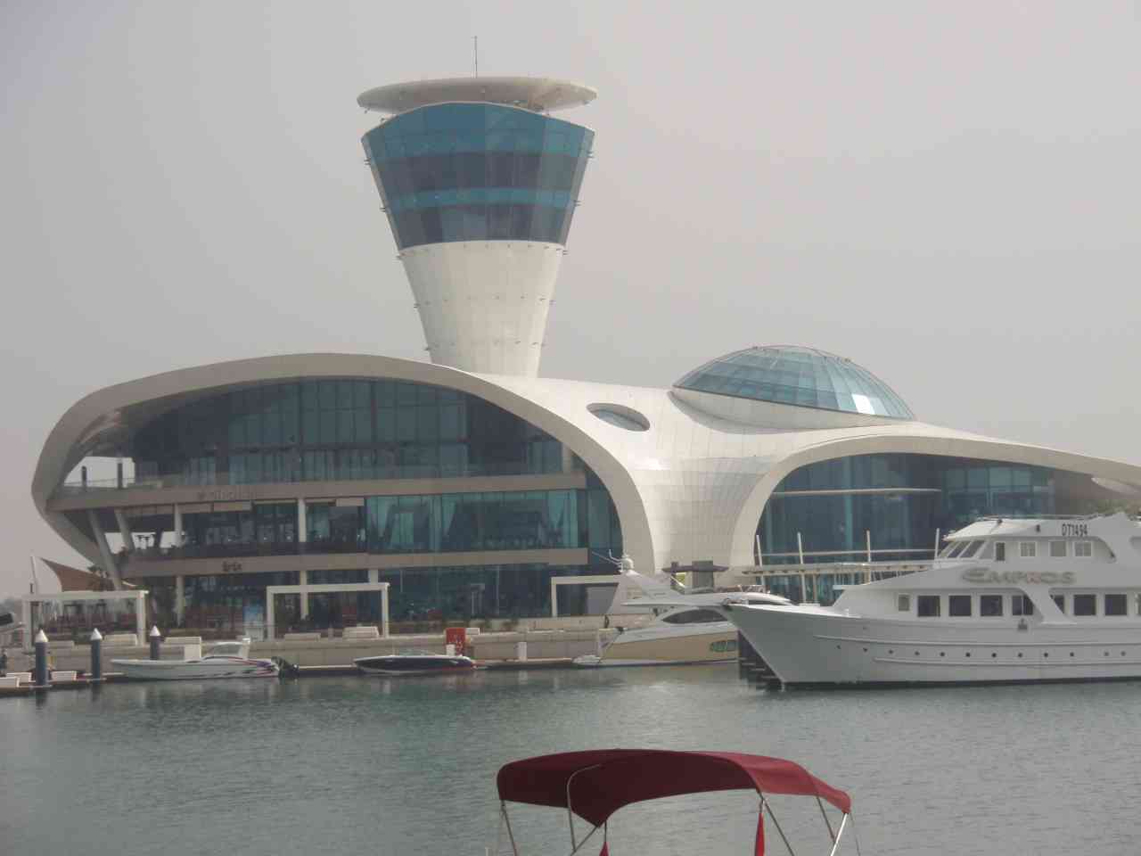 Es ist acht Uhr Morgens als wir aus dem Bett steigen und die Vorhänge öffnen. Es herrscht dichter Nebel hier auf Yas Island, man sieht nur ein paar Meter weit. Es ist zwar jeden Morgen dunstig aber so wie heute hatten wir bisher noch nicht erlebt. Nachdem wir uns fertig angezogen haben, gehen wir in den Speisesaal hinunter zum Frühstücken. Ich bestelle mir zuerst ein Omelett mit Schinken und Pilzen, danach hole ich noch Brötchen und Marmelade sowie etwas Käse. Zum Abschluss noch eine Schale mit geschnittenen Ananas, Hermine hat Ihr eigenes Frühstücks-Ritual. Als wir schon mit unserm Frühstück fertig sind, kommt das Ehepaar von gestern Nachmittag in den Speisesaal. Wir verabreden uns für später, sie wollen mit uns zum Viceroi Hotel und zur Yas Marina gehen um uns die großen Yachten zu zeigen die wir am Montag vergebens gesucht hatten. Um 10:30 verlassen wir unser Hotel und kurze Zeit später löst der Nebel sich tatsächlich auf und die Sonne kommt durch. Als wir die Brücke zum Hotel überqueren sehen wir ein paar Rennwagen auf der Rennstrecke fahren. Ich schätze es sind Fahrzeuge der Formel zwei oder drei, die hier Ihre Runden drehen. Wir gehen kurz in das Viceroi Hotel, es ist sehr modern und ein fünf Sterne Haus ob man es haben muss, kann jeder für sich selbst entscheiden. Zu Rennzeiten im November hat es klar Vorteile, dann kann man von den Balkons direkt auf die Rennstrecke sehen. Wir gehen weiter um die großen Yachten zu anzuschauen, die das Ehepaar uns versprochen haben. Ja heute sind sie schon größer als wir hier am Montag gesehen, ca. 25 Meter lang sind die größten Boote. Aber nicht das was ich erwartet habe, weder die Yacht Yas die wir in Barcelona gesehen haben noch die Yacht Azzam des Scheiks von Abu Dhabi beide passen aber hier nicht rein. Wie ich später daheim im Internet nachlesen konnte. Aber trotz allem ein paar Millionen sind sie trotzdem wert. Danach gehen wir zum Hotel zurück, das Ehepaar zeigt uns noch den direkten Weg zum Yas Strand der zum Hotel gehört und auch bequem zu laufen wäre.