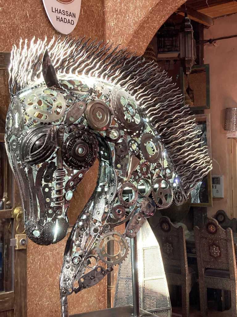 Nach ca. 15 Minuten fahren wir dann auch schon wieder den Berg hinunter ins Stadt-Zentrum hinein. Unser nächstes Ziel, wie wir feststellen, ist die Moschee Mohammed V. Sie wurde in den 60er Jahren des 20. Jahrhunderts errichtet. Leider können wir auch diese schöne Moschee im Innenbereich nicht besichtigen, aber ein Rundgang um das schön gestaltete religiöse Gebäude wäre durchaus möglich. Wir fahren weiter irgendwo im Außenbereich der Stadt kommen wir an ein Gehöft, das sich als Souk bzw. als Basar mit heimischer Handwerkskunst heraus stellt. Als wir ankommen stehen schon einige Busse mit Touristen auf dem kleinen Parkplatz. Hier kann man Marokkanische Pantoffel für die Herren und sonstige Lederwaren, Souvenirs und Keramiken, sowie Schmiedeeiserne Kunstgegenstände kaufen. Im Unter und Obergeschoß gibt es zwei Cafe`s in denen man Marokkanischen Minze-Tee trinken kann. Ebenfalls im Ober-geschoss befindet sich die hübsche Nachbildung eines Beduinenzeltes aus der Wüste. Auch hier verbringen wir eine gute dreiviertel Stunde. Für unsere Magnettafel kaufen wir einen Magneten auf dem sich unter anderem ein Kamel befindet.
