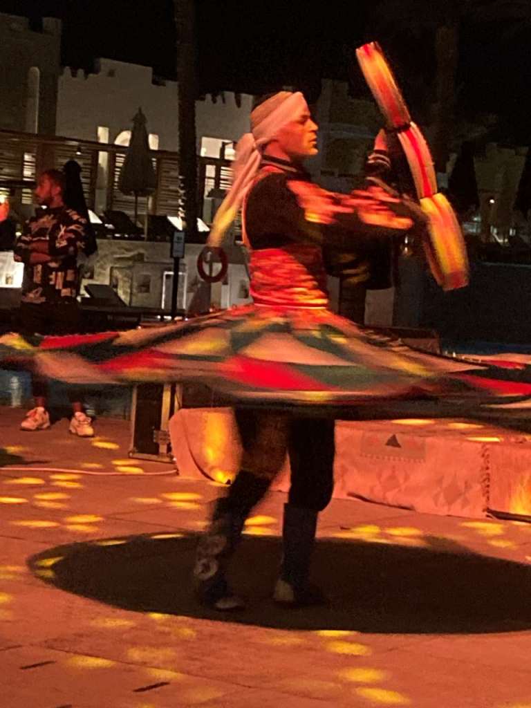 (Tanoura ist ein traditioneller Nationaltanz hier in Ägypten. Seine Besonderheit ist, dass nur Männer diesen Tanz aufführen Die Grundlage des Tanzes ist ein kreisender Tänzer der sich fortlaufend um seine Achse dreht, notwendigerweise gegen den Uhrzeigersinn. Ein Tanoura- Tänzer kann sich von 15 Minuten bis zu mehreren Stunden drehen!, und sich dadurch in einen Zustand der Trance bringen. Bei der Aufführung entstehen technisch anspruchsvolle Elemente mit Röcken, die den Tänzer vielschichtig bedecken. Eine flauschige und dramatische Schicht von Röcken dient als Attribut der Präsentation. Und erfahrene Tänzer beziehen Tamburine und andere Elemente in den Tanz ein)