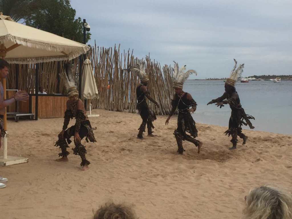 Um ca. 15:00 gehen wir zum Hotel-Pool hinauf , der Himmel war zwischenzeitlich ziemlich bedeckt. Plötzlich erscheinen Animateure aus unseren Hotel sowie vom Sunrise Royal in Afrikanischen Kostümen. Wir haben gelegentlich Kontakt mit einer ungarischen Animateurin, sie erzählt von einer Tanz-Veranstaltung die sie gleich am Strand machen werden. Wir beschließen danach ebenfalls zum Strand hinunter zu gehen, wo der Tanz schon begonnen hat. Sie haben einen Teil des Tukana-Strandabschnittes frei geräumt, wo jetzt mehrere Afrikanische Tänze vorgeführt werden.