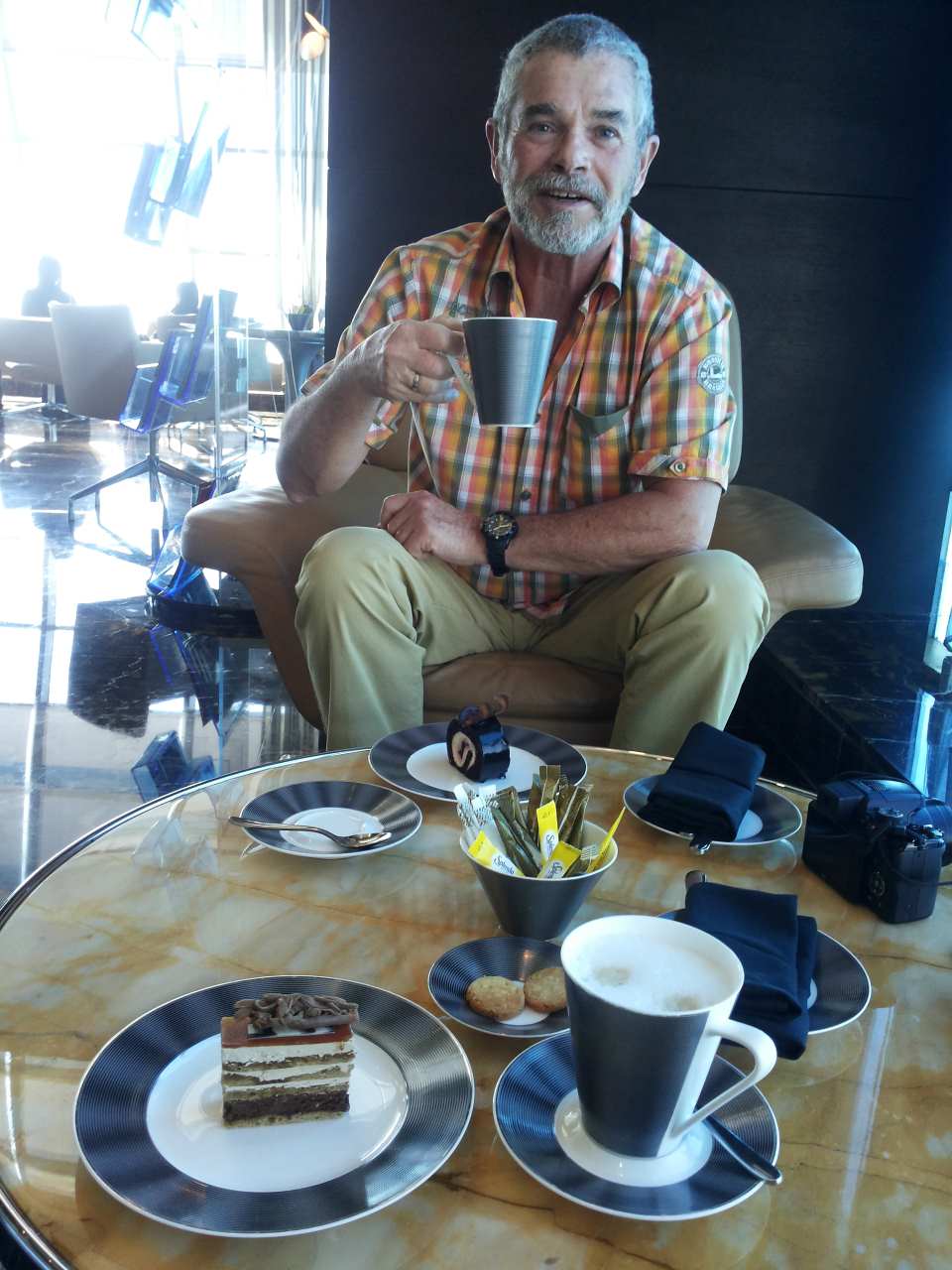 Guten Morgen wir haben ausgezeichnet geschlafen, es ist kurz vor 8:00 als wir aufstehen und danach zum Speisesaal im Erdgeschoss gehen. Auch heute ist einiges hier los. Die Hotelgäste die wir im Speisesaal sehen haben oft Afrikanische Wurzeln, im Gegensatz zum Mövenpick Hotel***** wo vorwiegend Gäste aus Indien, Pakistan oder Nepal waren. Nachdem wir Cappuccino und unsere Obstsäfte an unseren Tisch geholt haben, kommt auch schon unsere Tochter vorbei. Der Kleine und sein Vater schlafen noch selig. Bei einem der jungen Kellner bestellt sie ein paar Spiegeleier und holt sich noch andere gesunde Sachen dazu. So verbringen wir eine Stunde gemütlich beim Frühstück, bevor sie mit einem Teller bewaffnet nach oben geht. Was aber nicht gern gesehen wird. Wenig später kommt unser Schwiegersohn in den Speisesaal, auch er bringt einen großen Hunger mit.