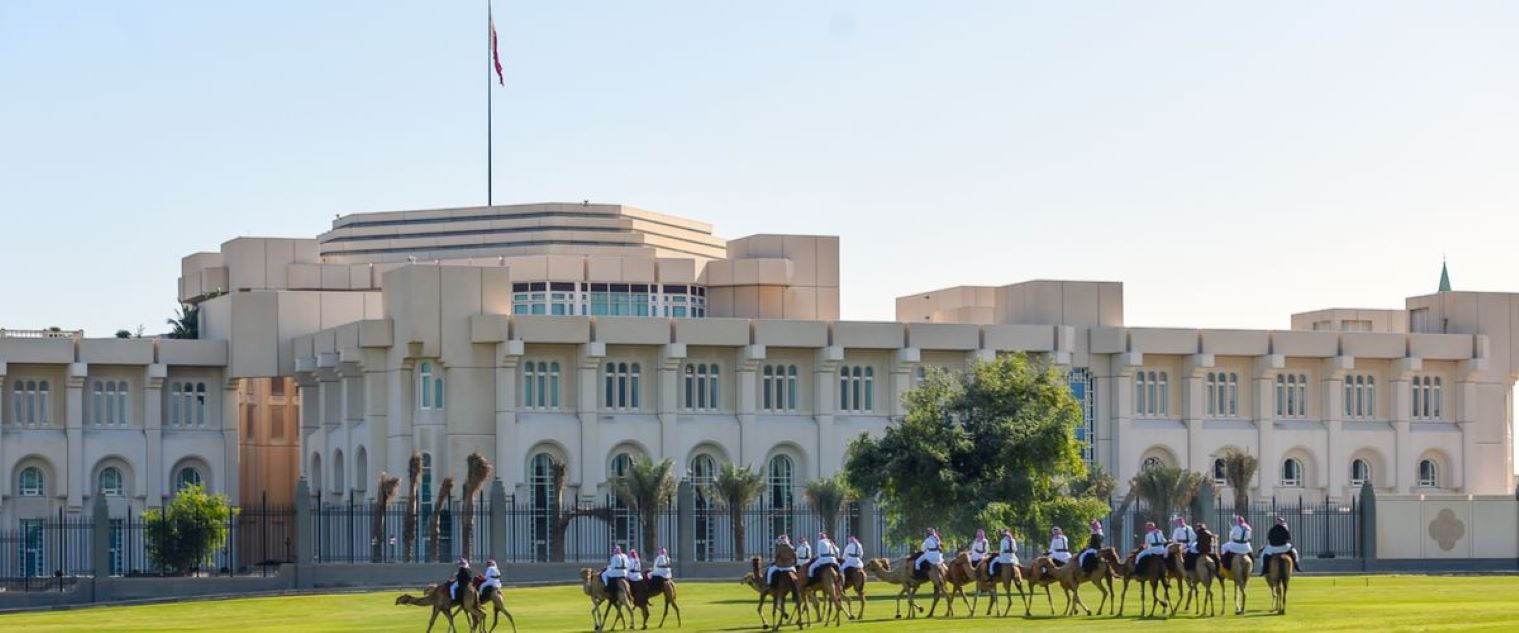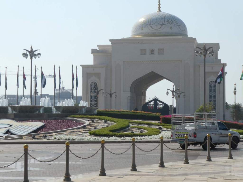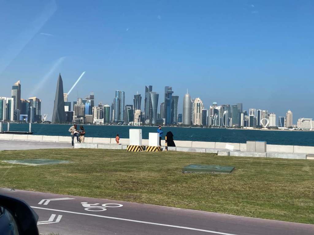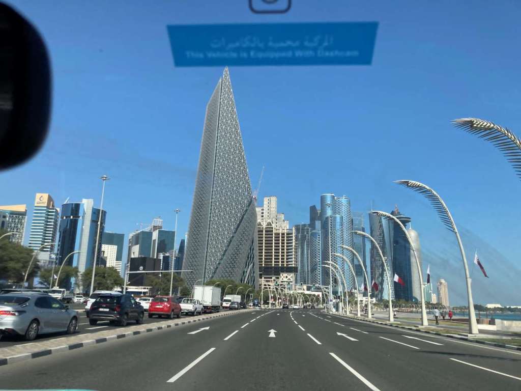 Als nächstes müssen wir die mehr als 8 spurige Corniche überqueren, was sich als nicht so einfach heraus stellt. Aber irgendwann gelingt uns das und wir befinden uns wieder im Al Dafna Park wo wir eine ganze Weile auf ein Taxi warten müssen. Es kommt keines, nach einer geschätzten halben Stunde fährt ein Privat-Auto in die Einbiege-Spur wo wir stehen. Er fragt uns, was los ist und wohin wir wollen. Vielleicht wollte er etwas Geld verdienen, auf jeden Fall nimmt er uns mit und fährt uns zum Doha Port. Leider haben wir jetzt Rush Hour fast genauso wie in Dubai um ca. 17:00. Auf unserem Weg kommen wir wieder am Amiri Diwan, dem Offiziellen Amtssitz des Emir von Katar vorbei. Hier kommt gerade eine Gruppe Reiter auf Kamelen die Straße entlang. Das sei Tradition an jedem Sonntag hier in Doha, erzählt unser Fahrer.